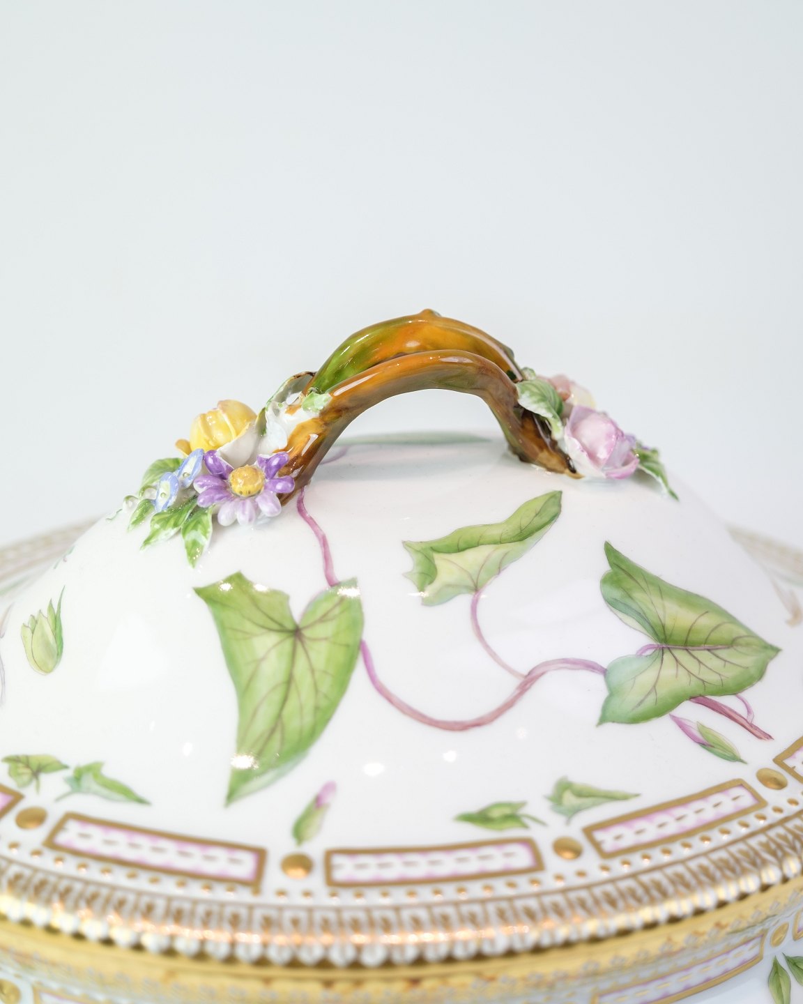 Terrin fra Royal Copenhagens Flora Danica-serie, udført i porcelæn og håndmalet med dekoration nr. 20/3559. Terrinen er rigt dekoreret med naturtro blomster og forsynet med låghank og to sidehanke udformet som grenmotiver med blomster og blade i farver.