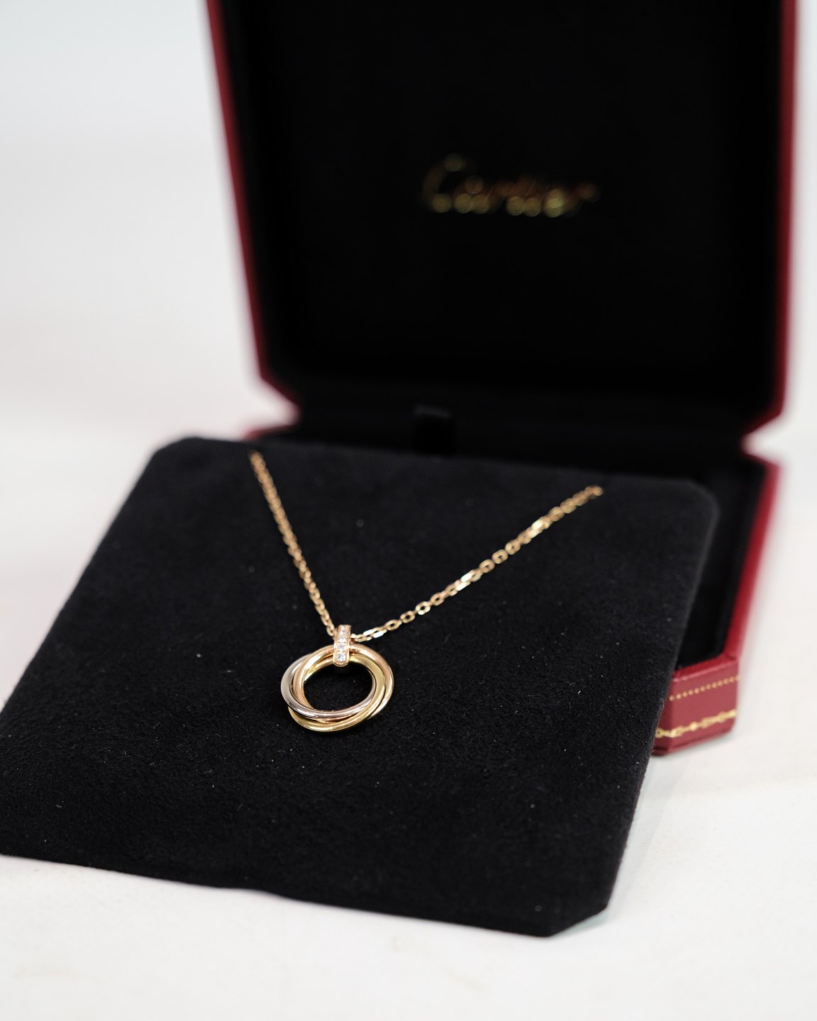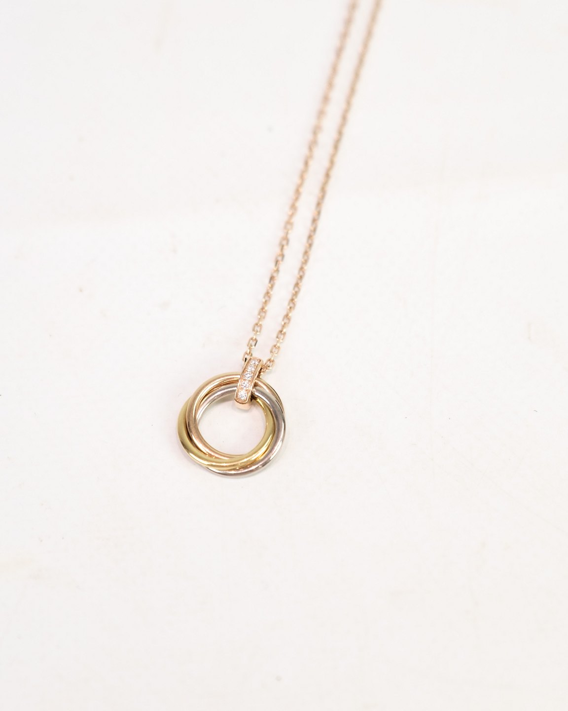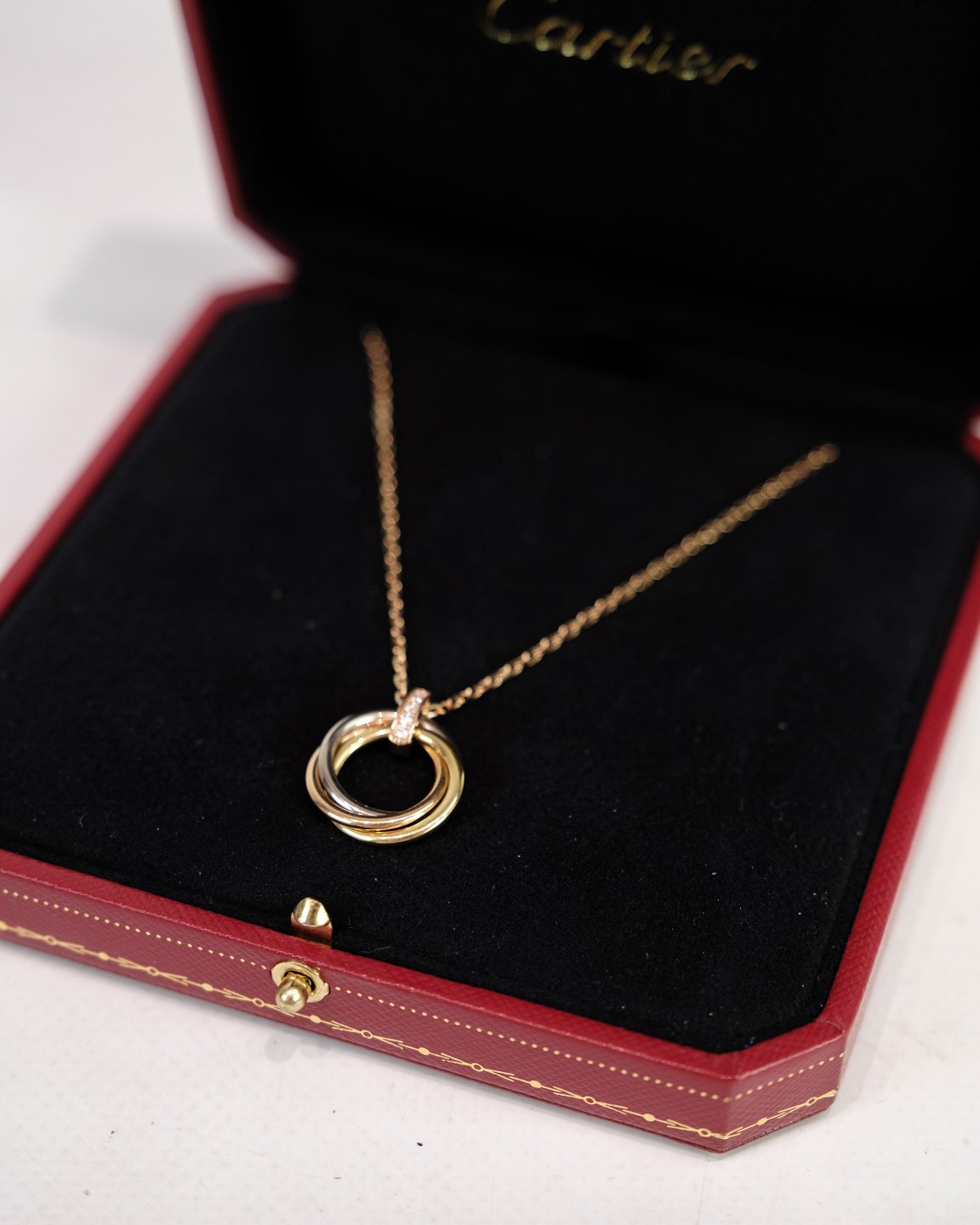 Halskæde fra Cartier, fra Trinity-kollektionen. Kæden er udført i 750 roséguld med sikkerhedslås og prydet med et vedhæng bestående af tre sammenflettede ringe i hvidguld, roséguld og gulguld – en klassisk Cartier-signatur.