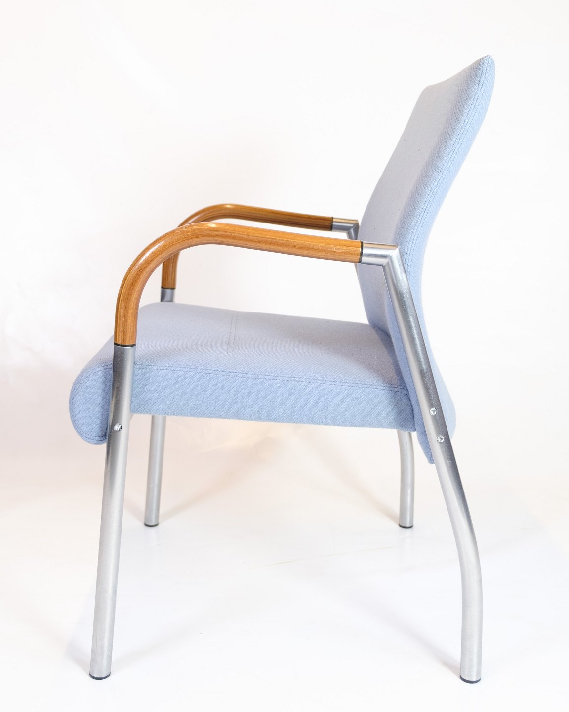 Spisestuestol fra Duba, model B8. Blåt stof, mahogniarmlæn og metalstel. Produceret i 2002.