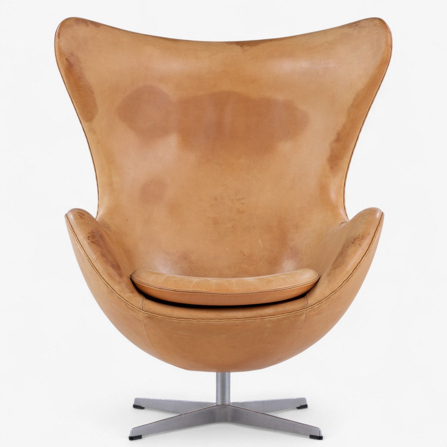 AJ 3316 - 'Ægget'-lænestol i patineret naturskind på aluminiumsfod. Ægget (1958) blev tegnet til SAS Royal Hotel i København sammen med Svanen og Gryden. Stolen er i dag et designikon.