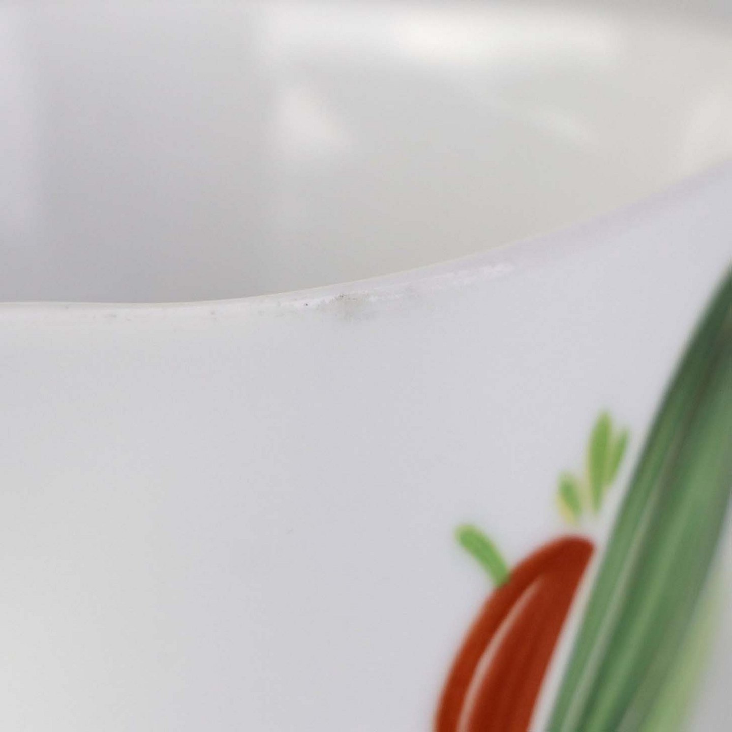 Stellet er i glat hvidt porcelæn med varierende farverige motiver af frugter og grønt.