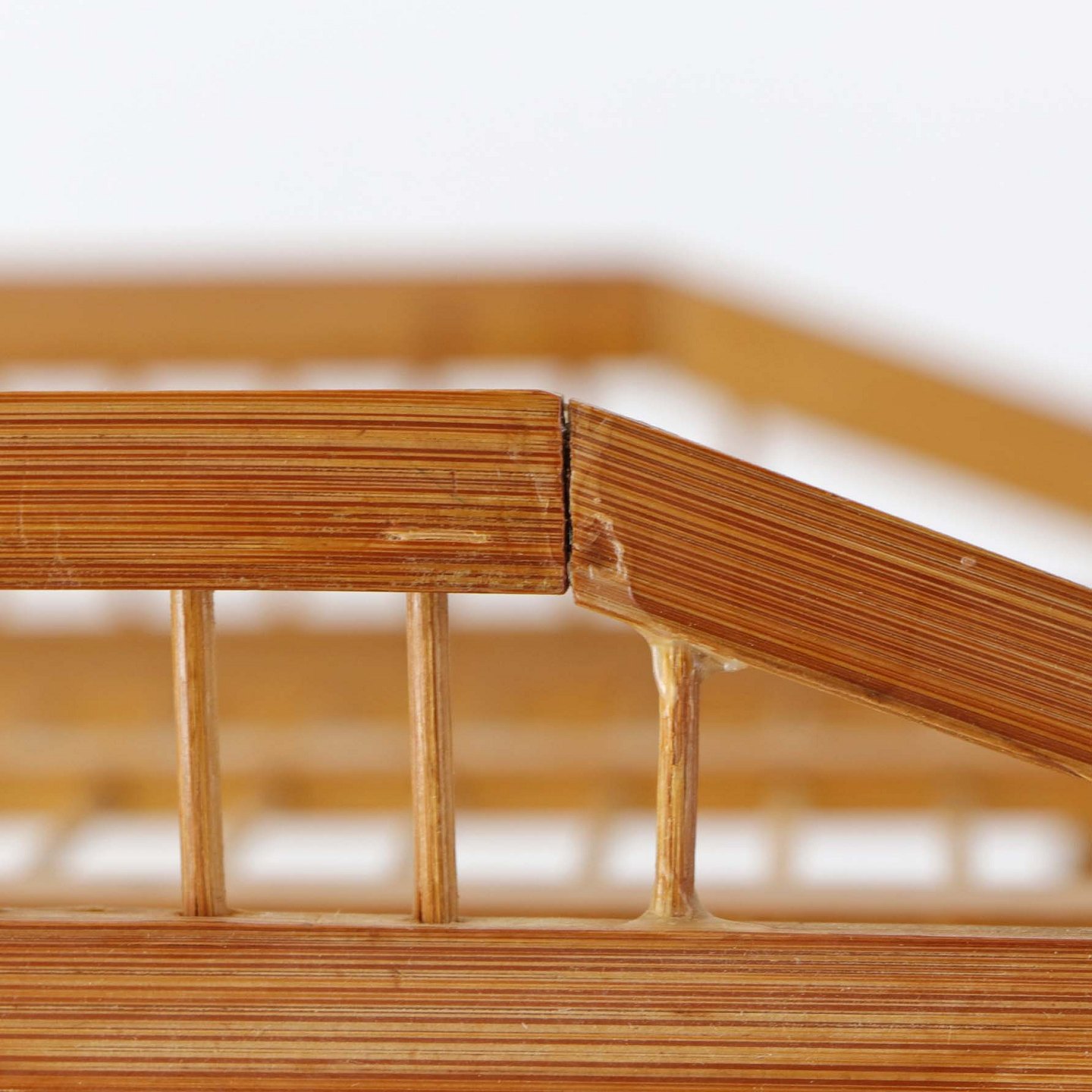 Papirbakke i bambus fremstillet i tremmeform. Brevbakken passer til A4 papir og består af tre sammensatte bakker og kan foldes ud efter behov.