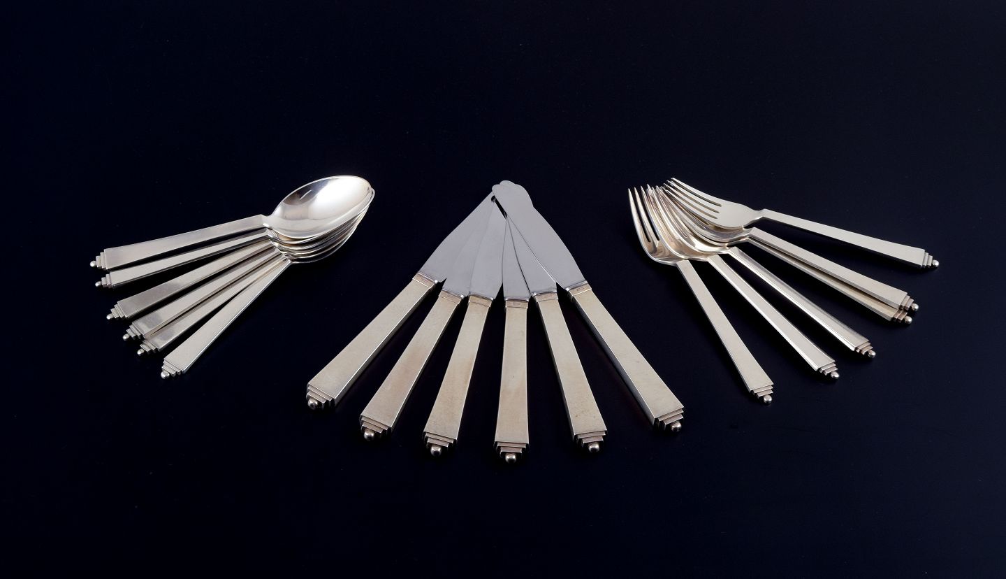 Komplet sekspersoners middagsservice i sterlingsølv.