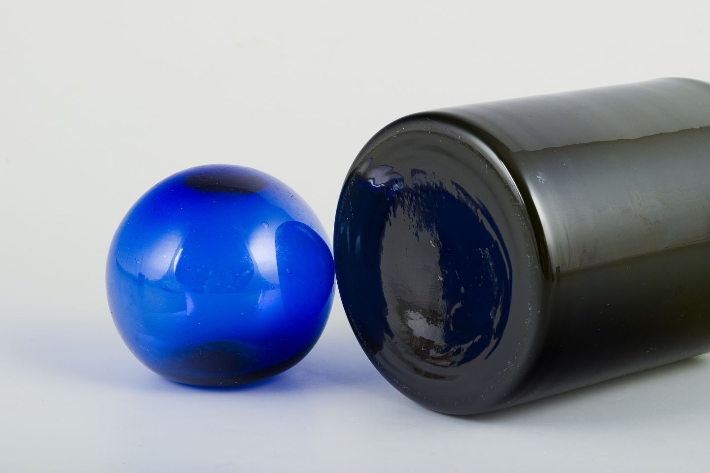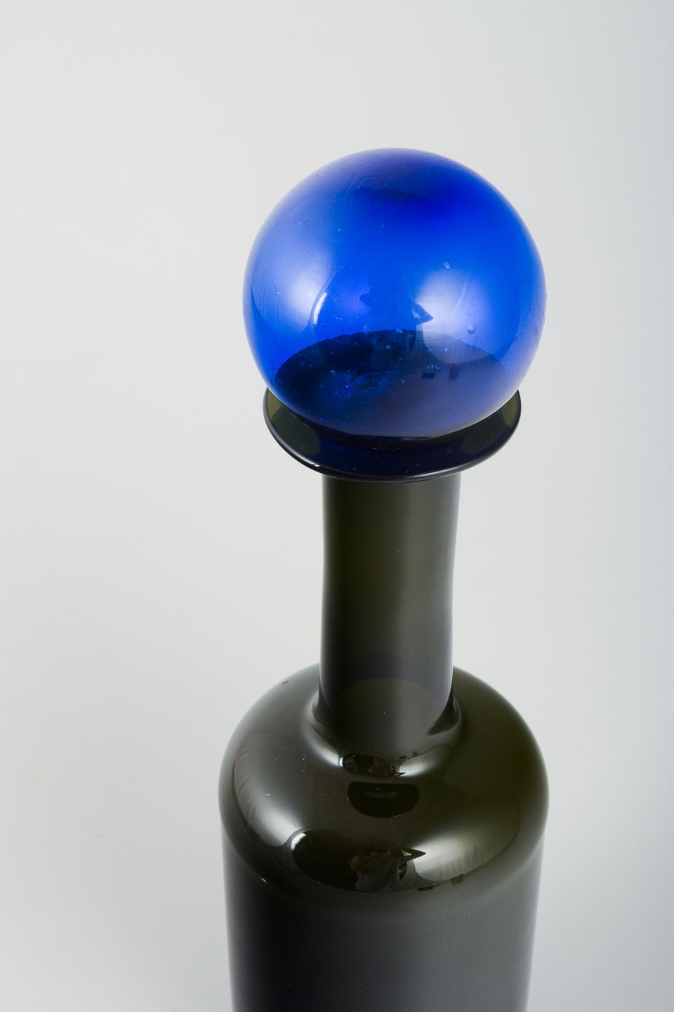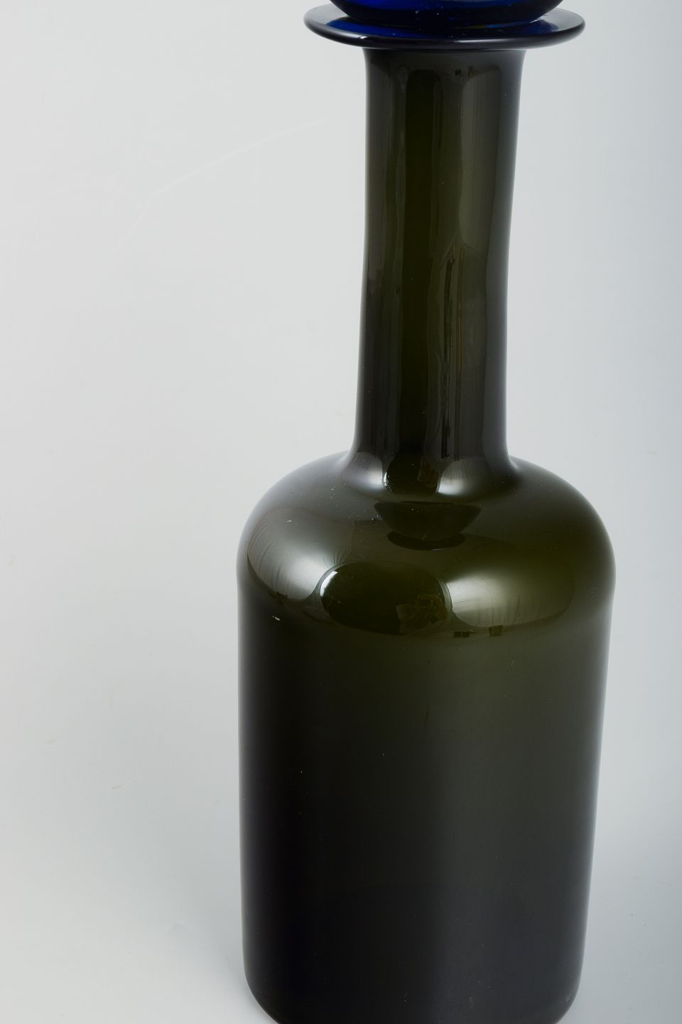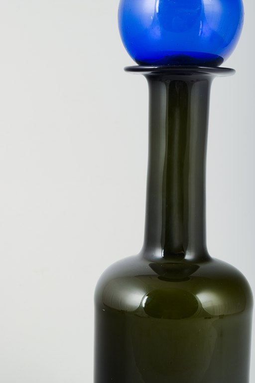 Otto Brauer for Holmegaard. Stor vase/flaske i flaskegrønt kunstglas med blå kugle.