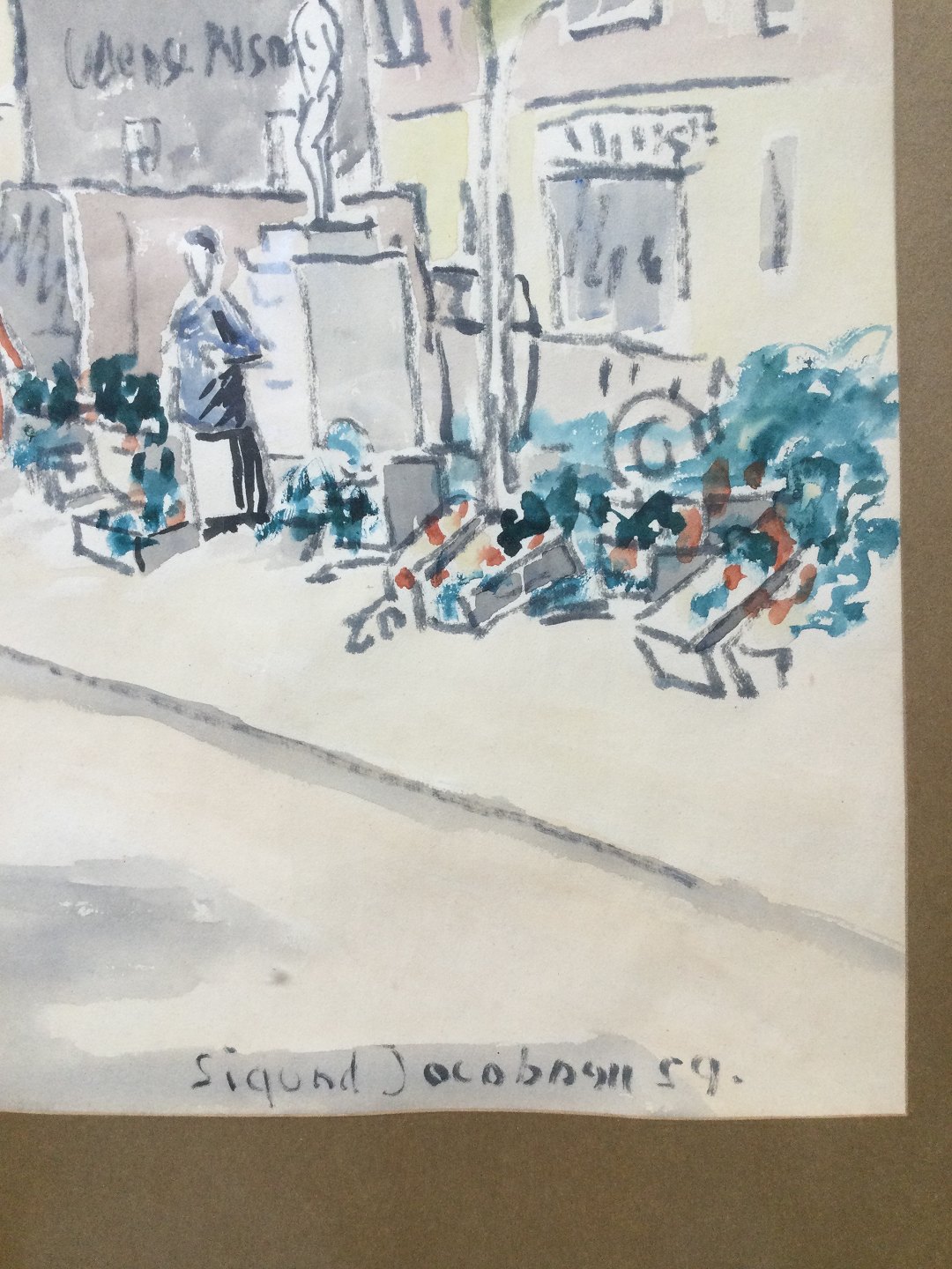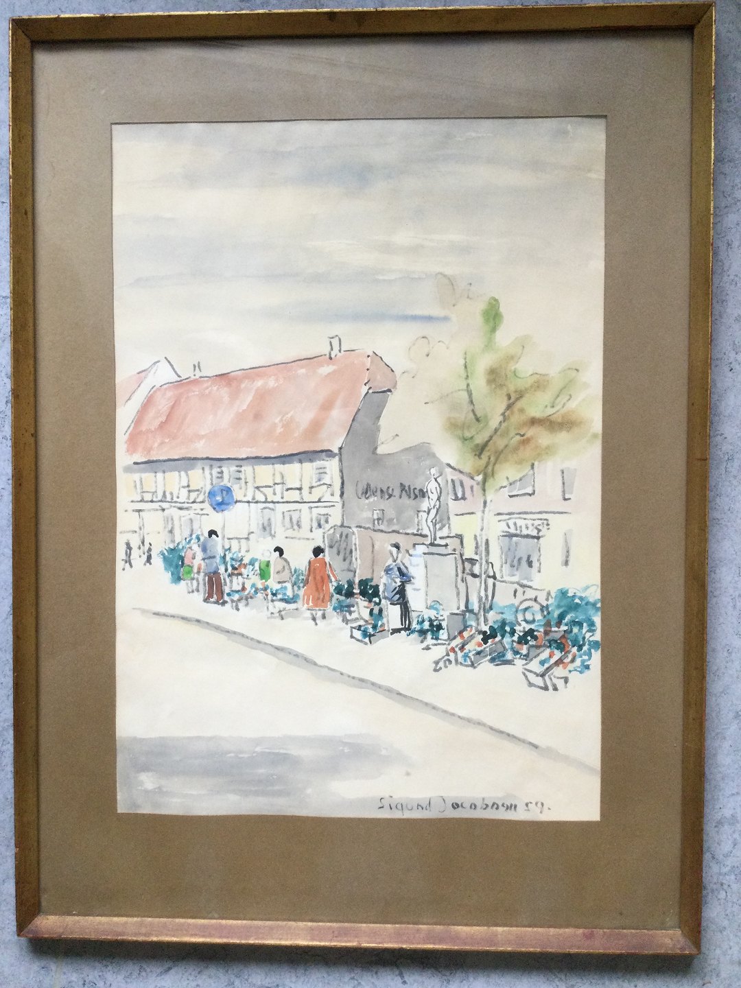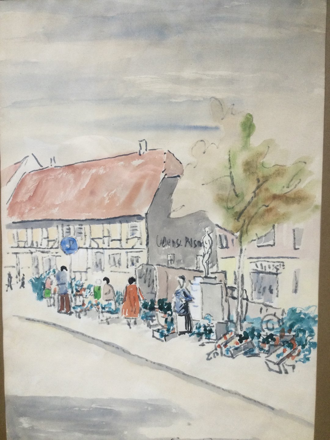 Akvarel af Sigurd Jacobsen - Markedsdag i Odense 1959.