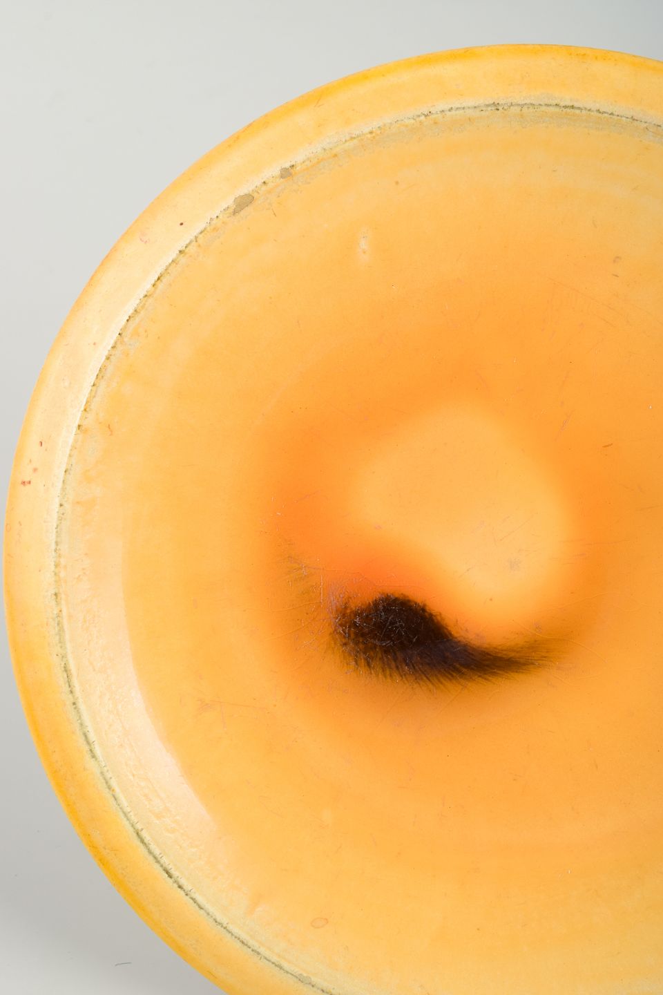 Lille, lavt fad designet af Svend Hammershøi for Kähler, udført i 1930’erne. Glaseret i varme gule og brune nuancer med let spil i overfladen, der fremhæver den enkle, funktionelle form. Den lave profil gør fadet velegnet både som serverings- og dekorationselement.