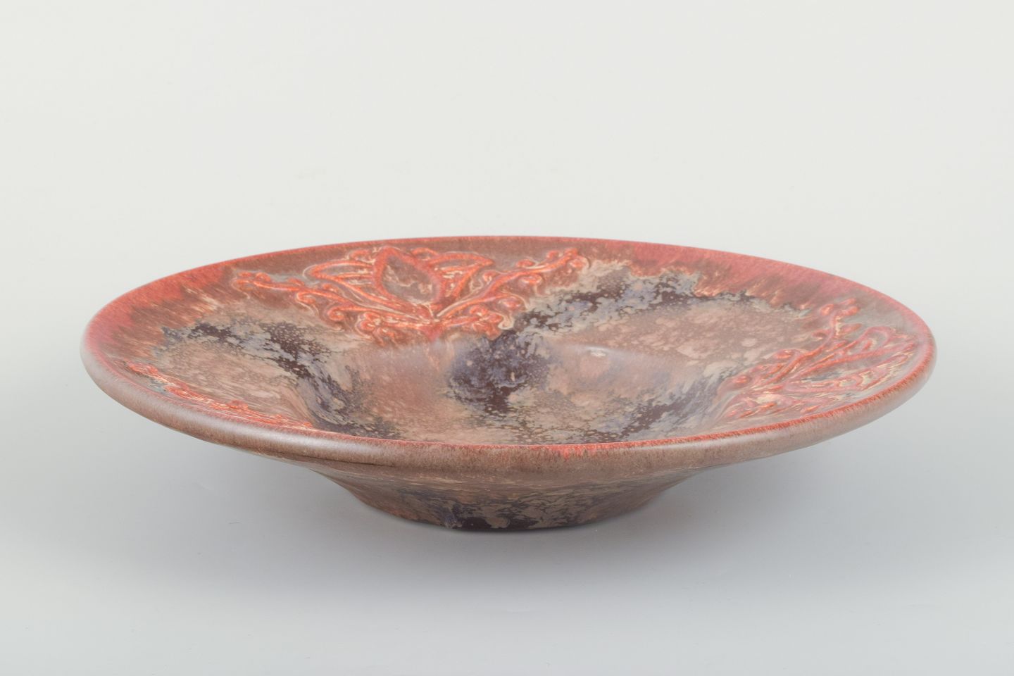 Stort, dekorativt fad fra Michael Andersen, udført i 1960’erne. Dekoreret med reliefmønster langs randen samt en flerfarvet glasur i nuancer af rød, brun og sort med levende spil i overfladen. Glasuren fremhæver relieffets detaljer og giver fadet et markant, kunstnerisk udtryk.