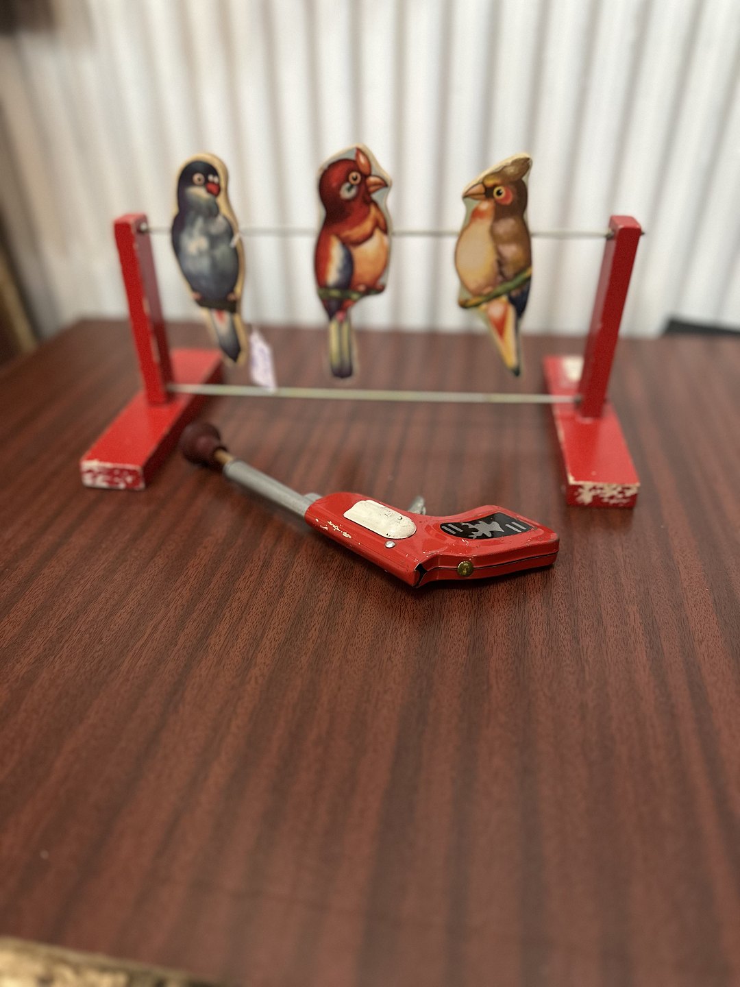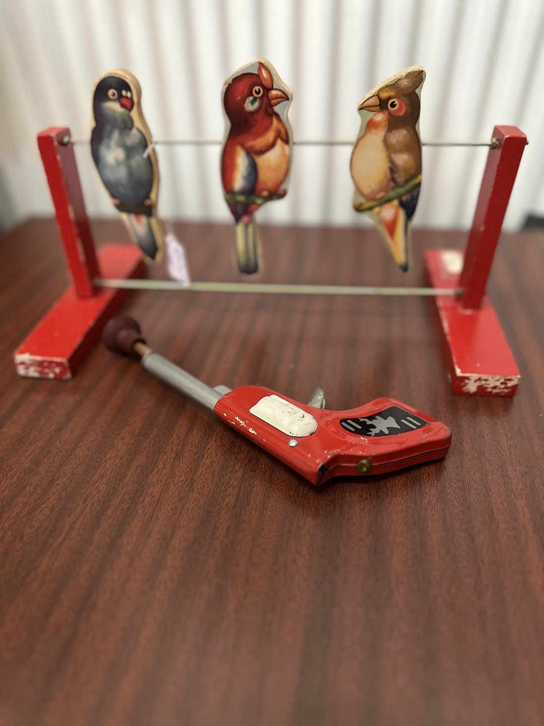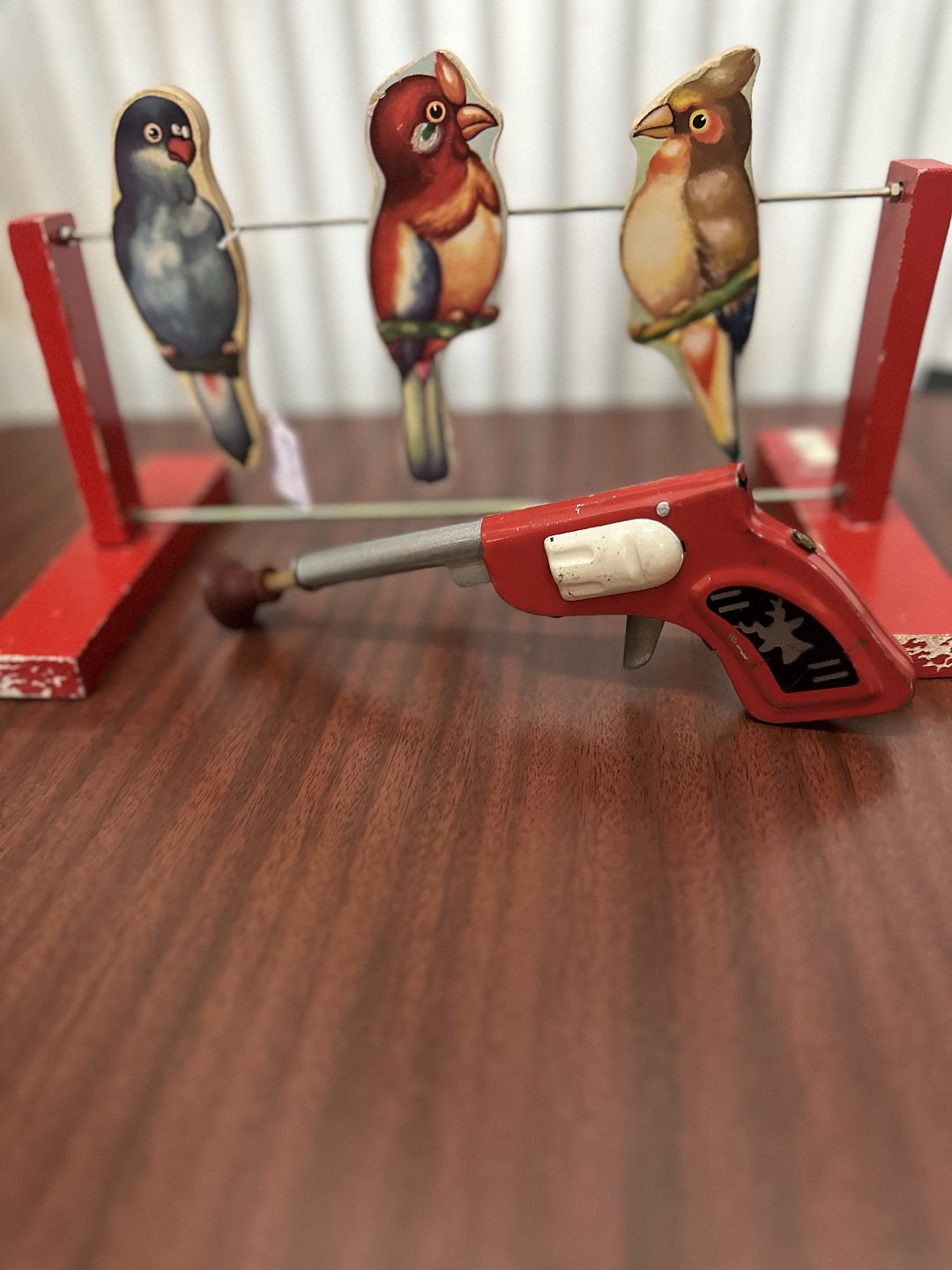 De tre fuglefigurer er monteret på en metaltråd . med lille fjederdrevet pistol