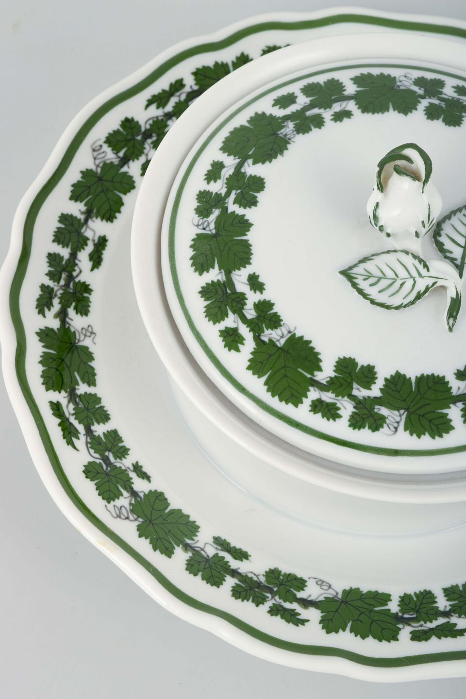 Founded in 1710, Meissen Porcelain was Europe’s first porcelain manufactory and quickly became famous for its unmatched craftsmanship and artistic innovation. Among the factory’s iconic services is the Vine-Leaf Pattern, in German “Voller grüner Weinkranz”, introduced around 1817 by Johann Samuel Arnhold. The decoration with green vine leaves and winding tendrils became one of Meissen’s most popular patterns and continued into the 20th century and beyond. The service reflects Meissen’s fascination with nature’s ornamentation and the precise hand-painted artistry that has made the manufactory a symbol of European porcelain tradition.