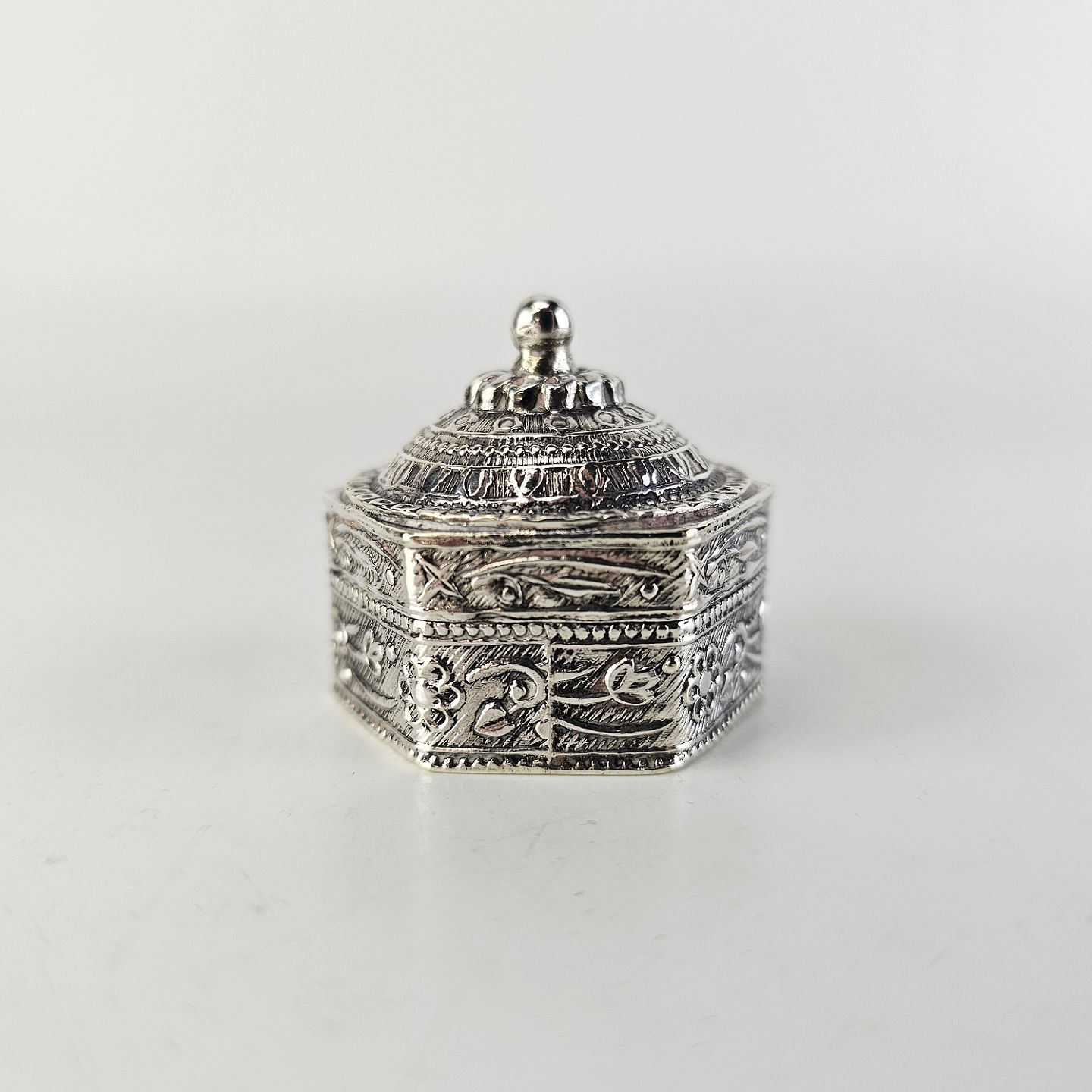 Lille dåse i sølv med koppellåg og dekoreret med blomsterranker