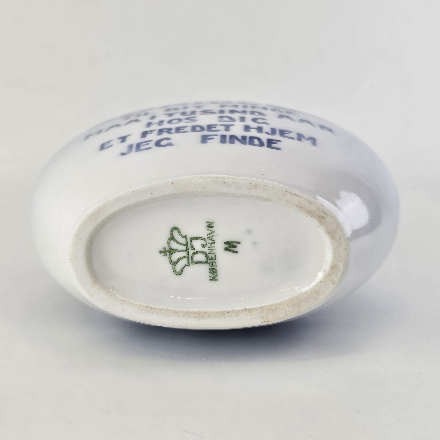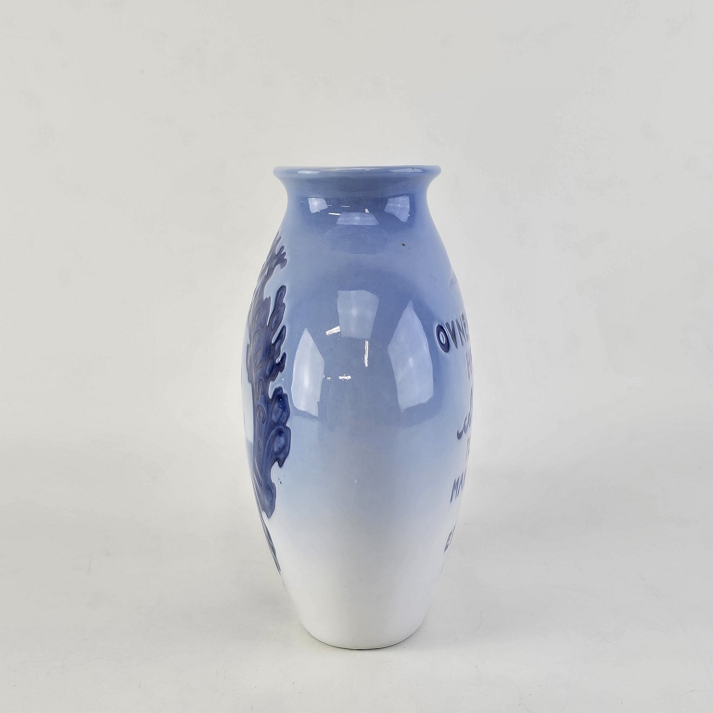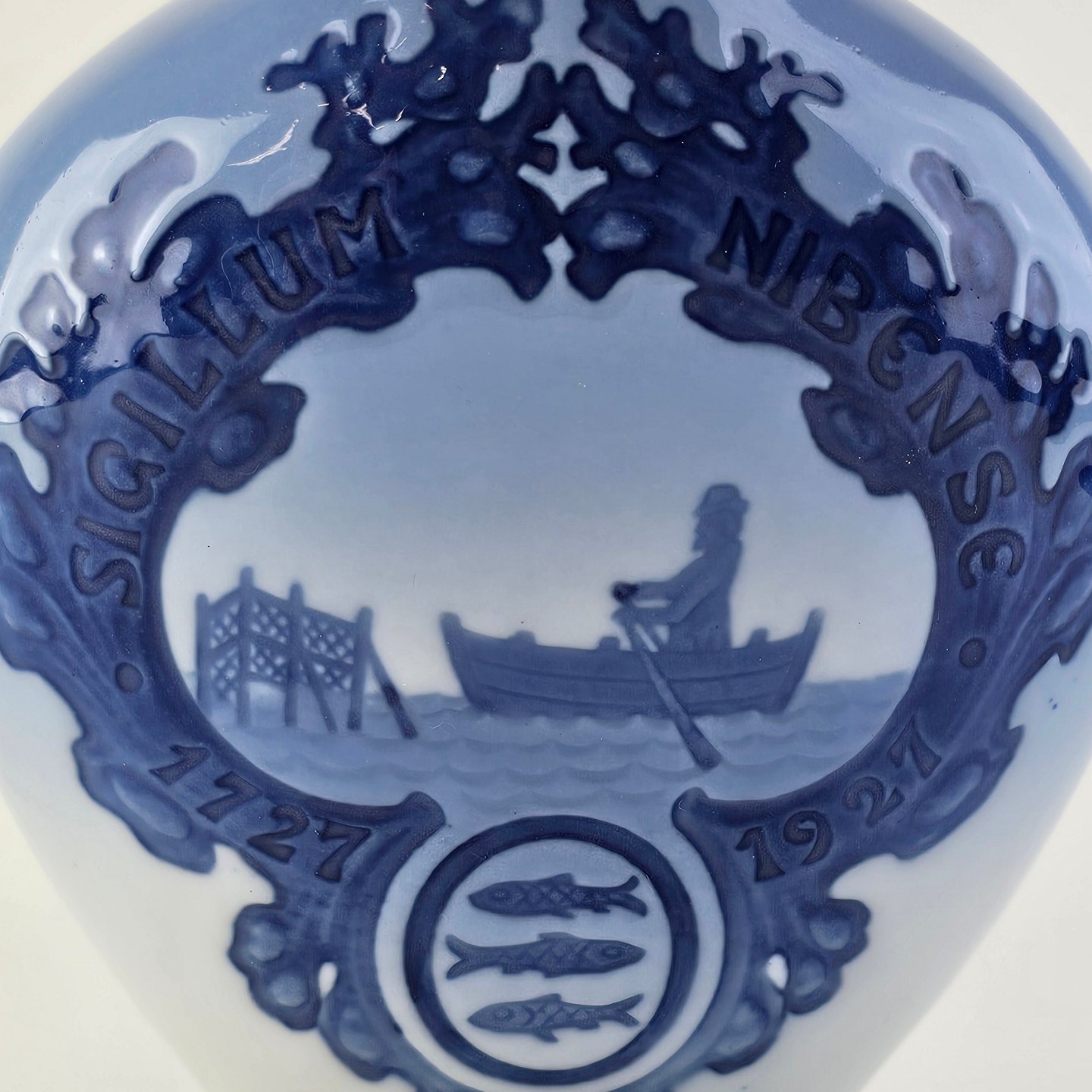 Vase i hvidt porcelæn med motiv i blå nuancer, produceret i anledning af Nibes 200 års jubilæum som købstad