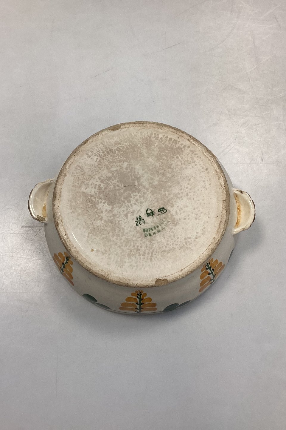 Aluminia Golden Rain (Laburnum) Terrine without lid No. 10/653. Cracks, hairline cracks and small chips.