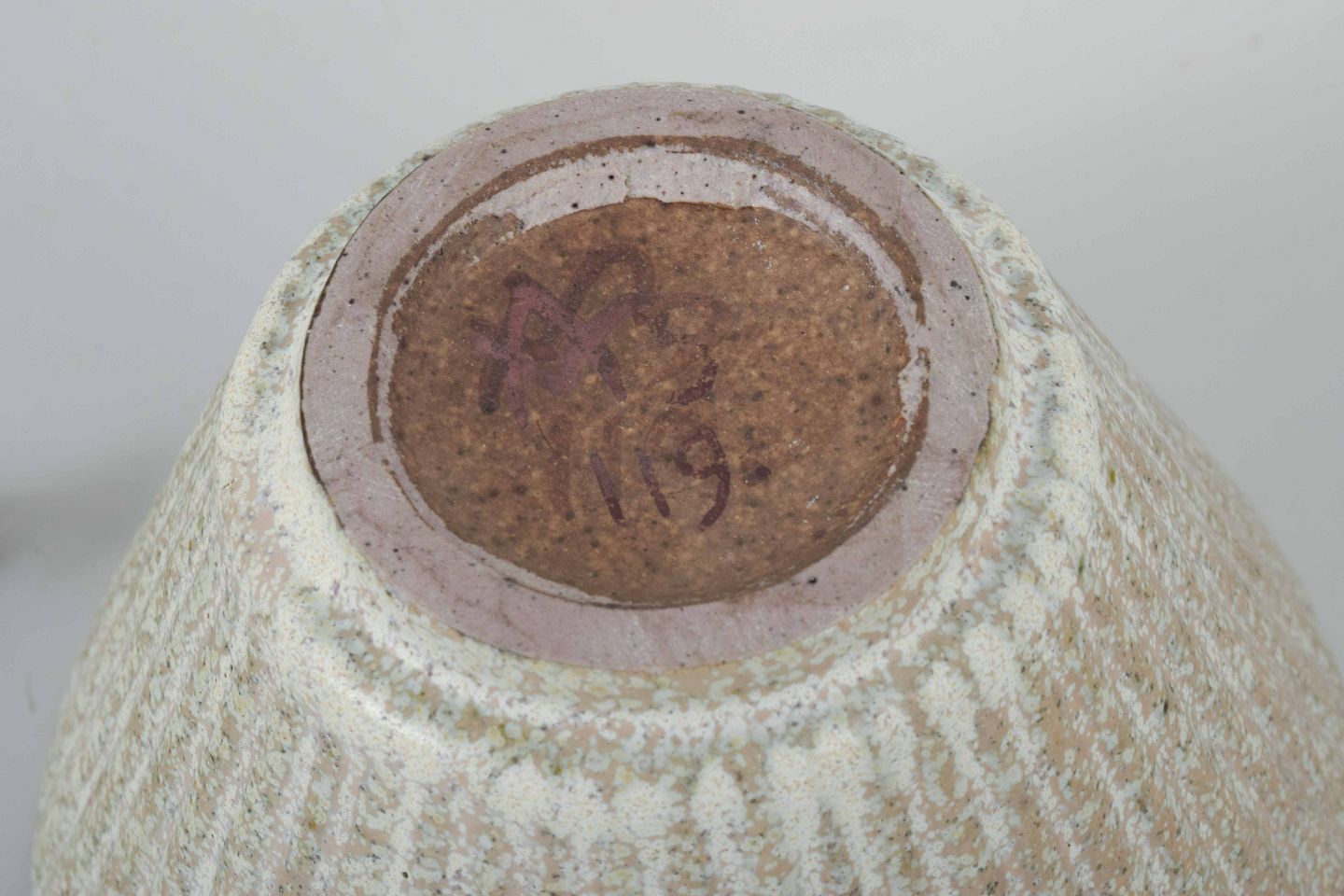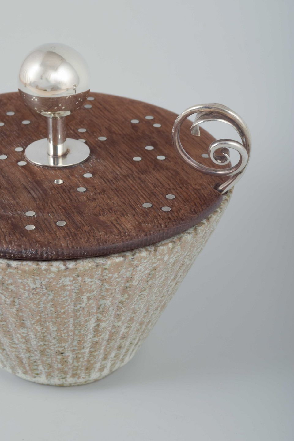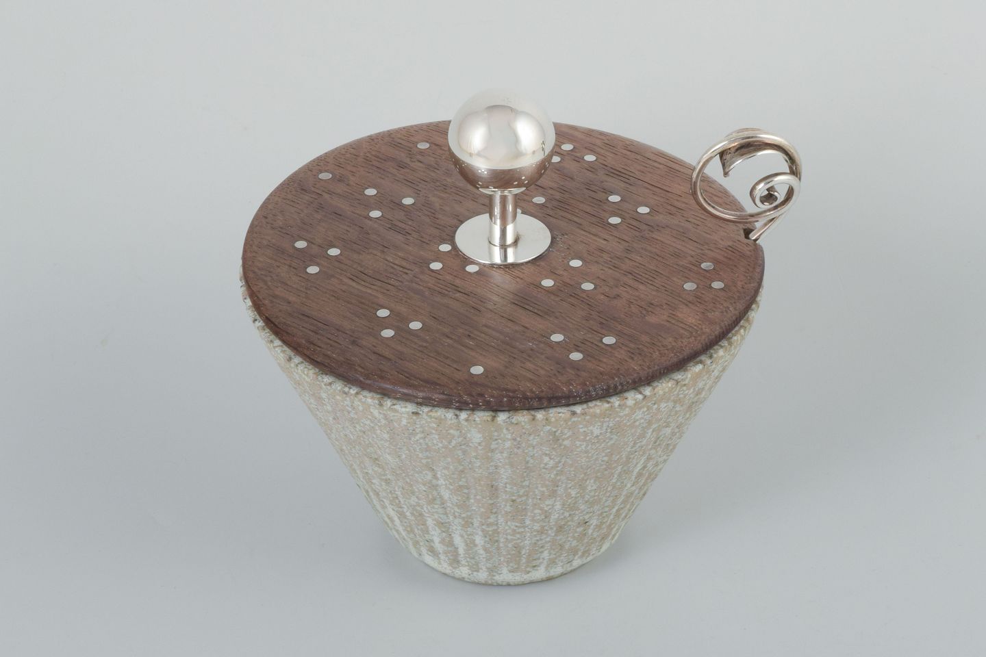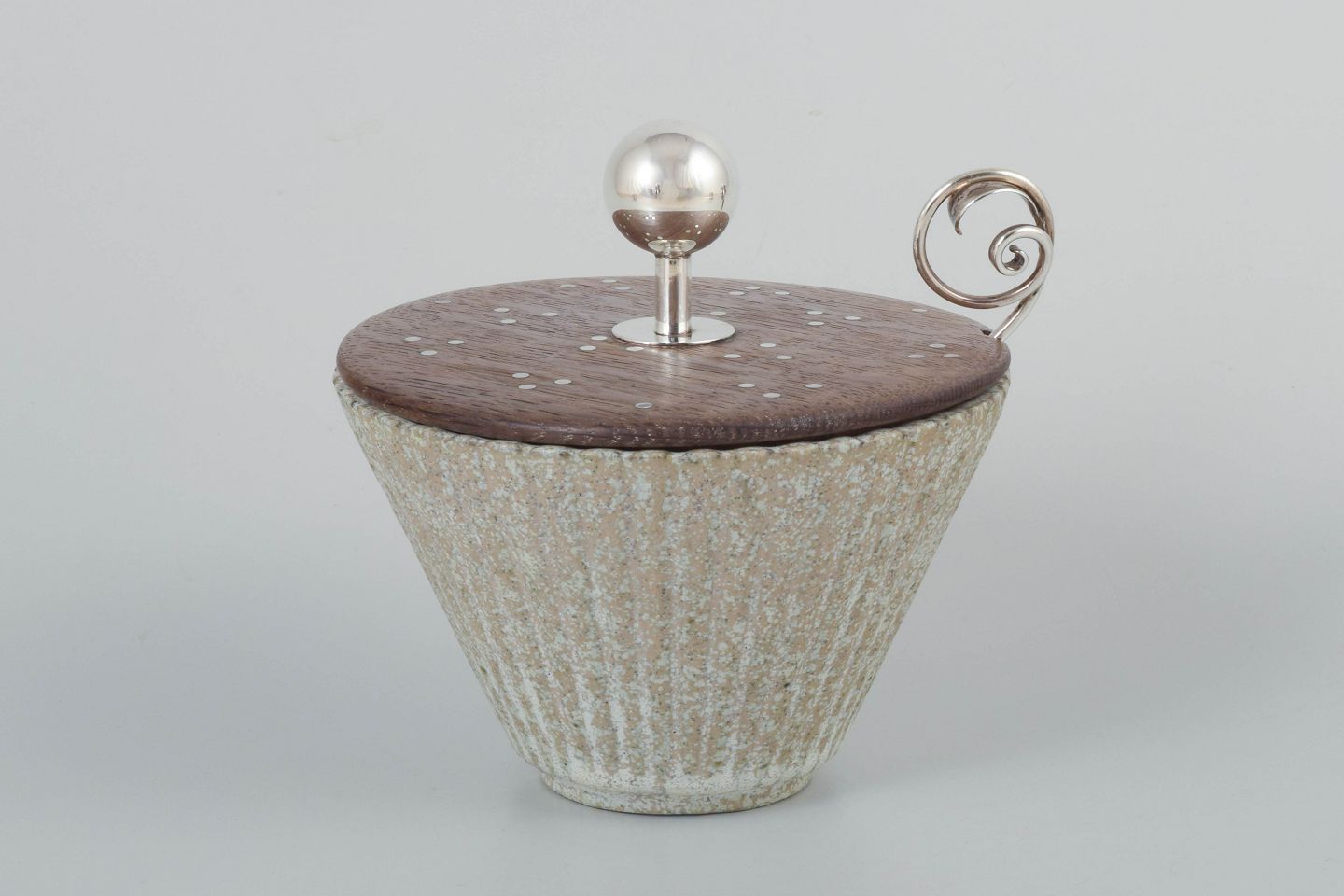 Konisk formet stentøjsskål i lysegrå glasur med riflet struktur. Låg i træ med sølvindsatser, afsluttet med kugleformet knop og svunget hank i sølv. Tilhørende sølvske stemplet 830S. Låget mærket Fr. Hingelberg Aarhus 925S. Skålen signeret under bunden med monogram og modelnummer 119.