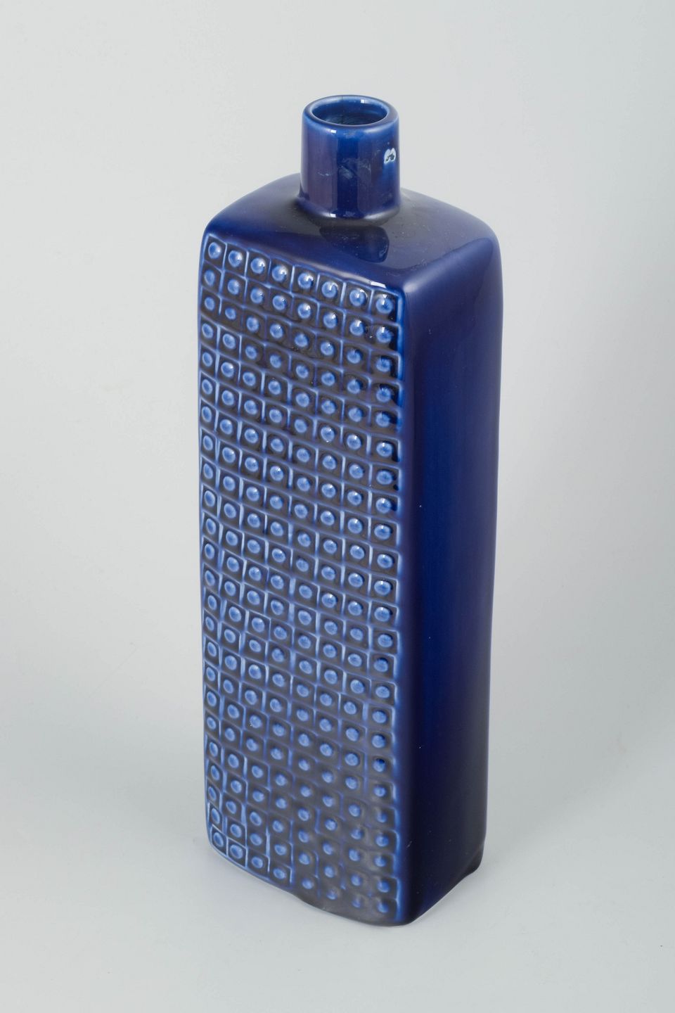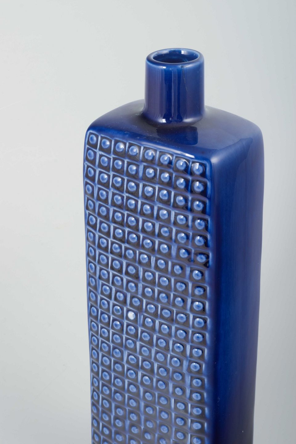 Høj, rektangulær vase i stentøj med mørkeblå glasur. Den ene side dekoreret med et reliefmønster af små cirkulære felter i lysere blå nuancer, der skaber en geometrisk og rytmisk overflade. Bunden signeret "Bengt" og dateret 19-3-64 samt mærket med modelnummer.