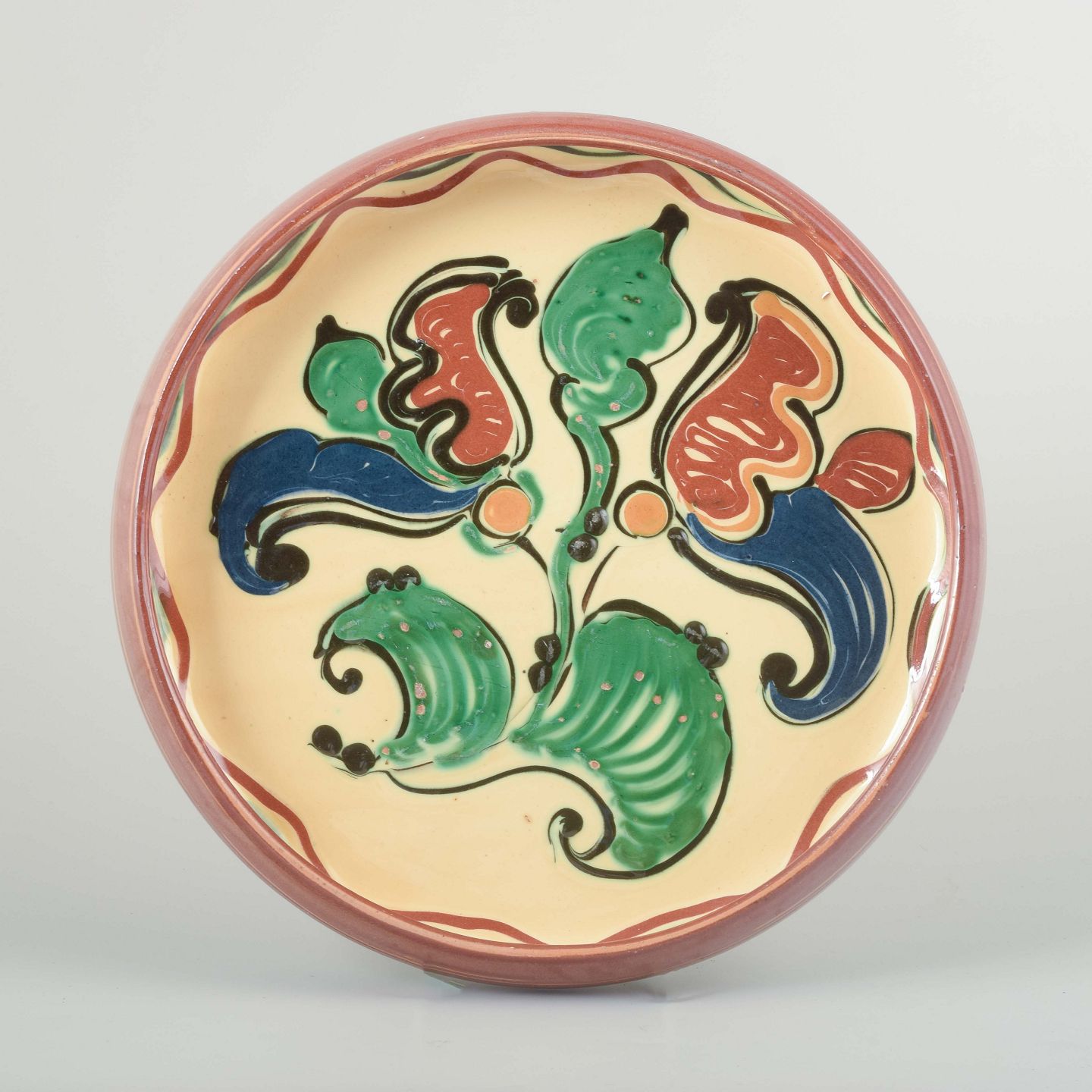 Et dekorativt værk fra Kählers værksted, hvor kraftige farver og organiske ornamenter forenes i et stiludtryk, der kombinerer traditionel keramik med periodens dekorative modernisme.
