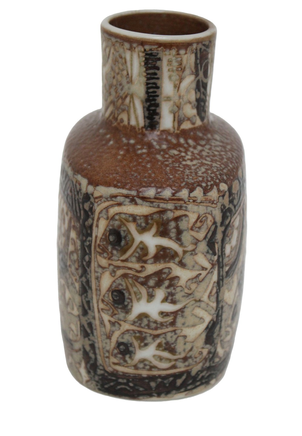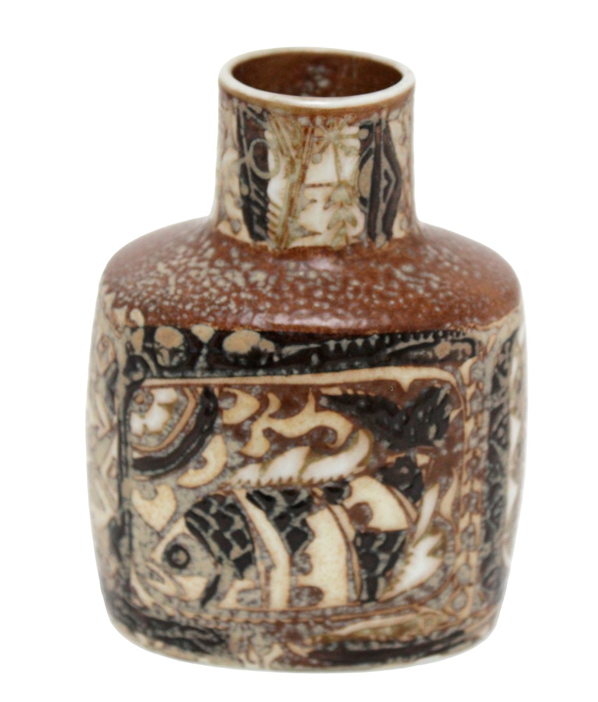 Text available in Danish: Royal Copenhagen, Baca Kunstfajance firkantet lille vase i brun og gylden glasur med Fiskemotiver på alle 4 sider. Designet af Nils Thorson. Nr. 719/3207. Højde 13 cm. Længde 10 cm. Bredde 6,5 cm. Top diameter 4,5 cm. II. sortering. Pris: 300 kr.