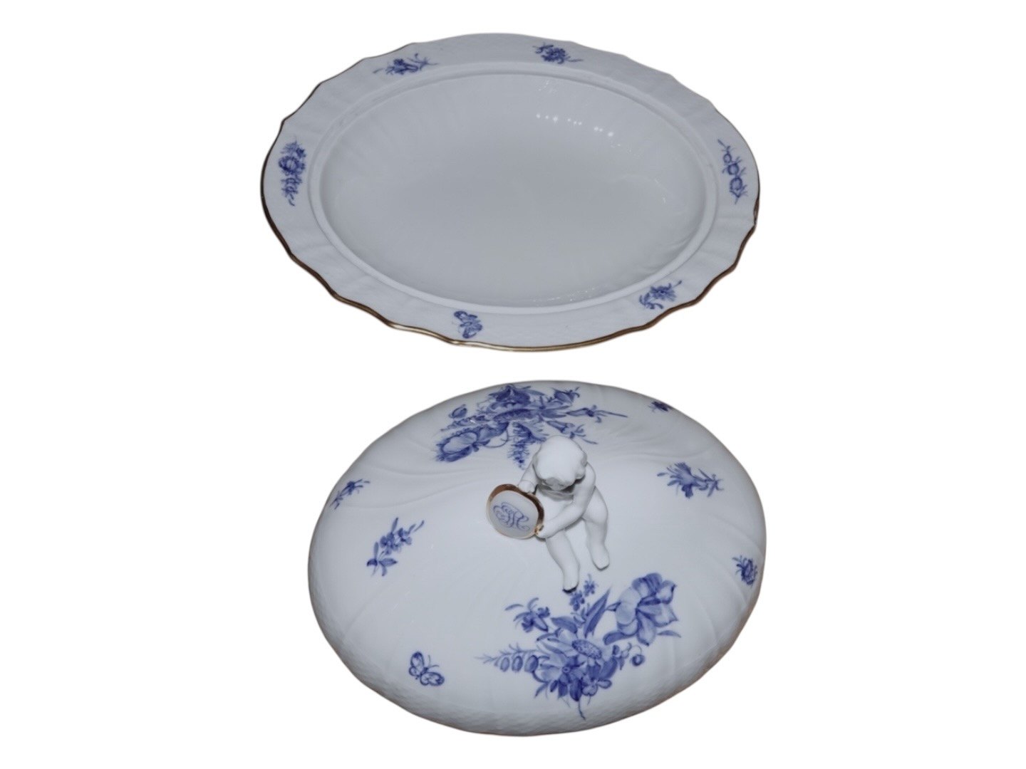 Royal Copenhagen Blå Blomst Svejfet med guldkant, stor og sjælden skål med låg med figur af dreng (putto). Der er malet monogram på skjoldet ved puttien.