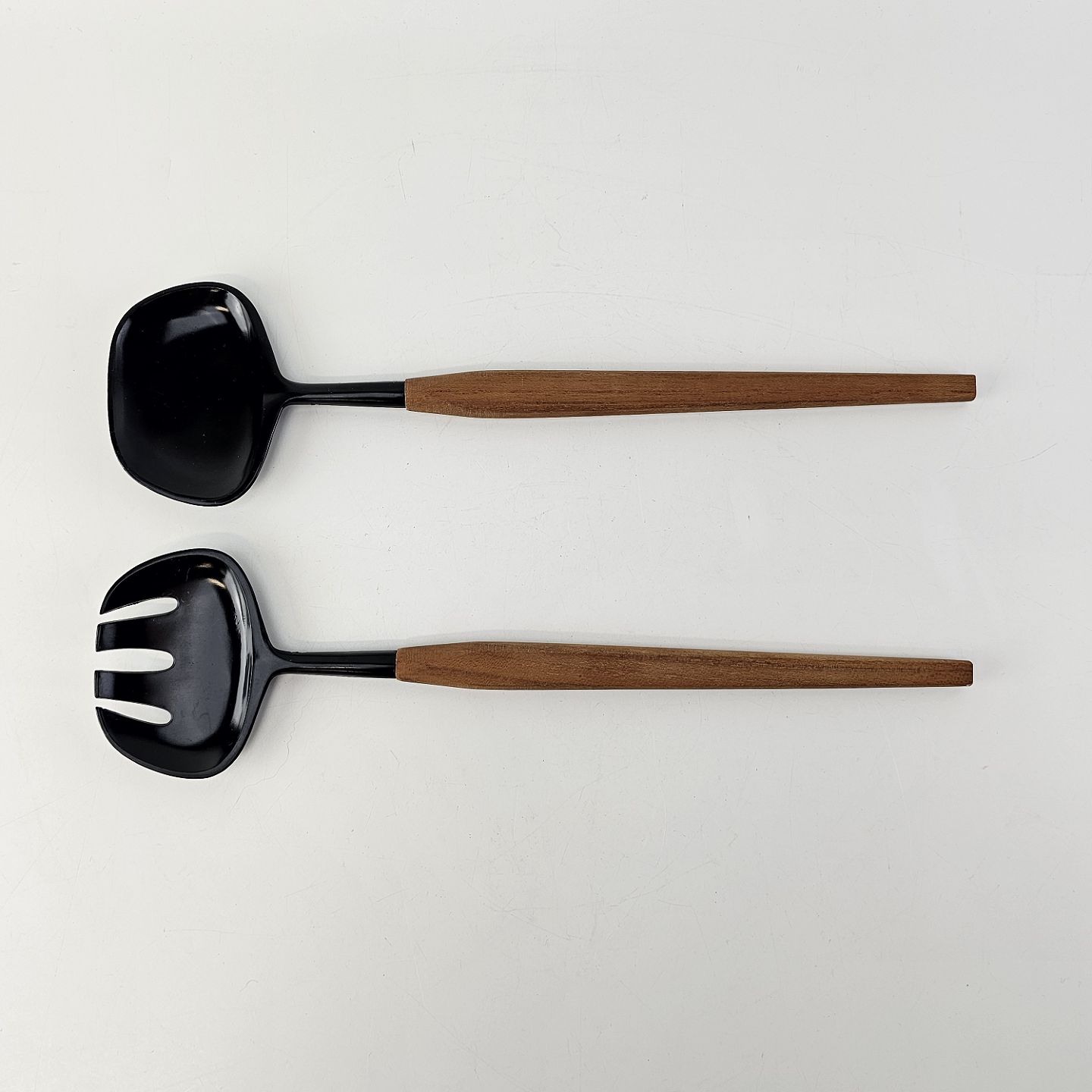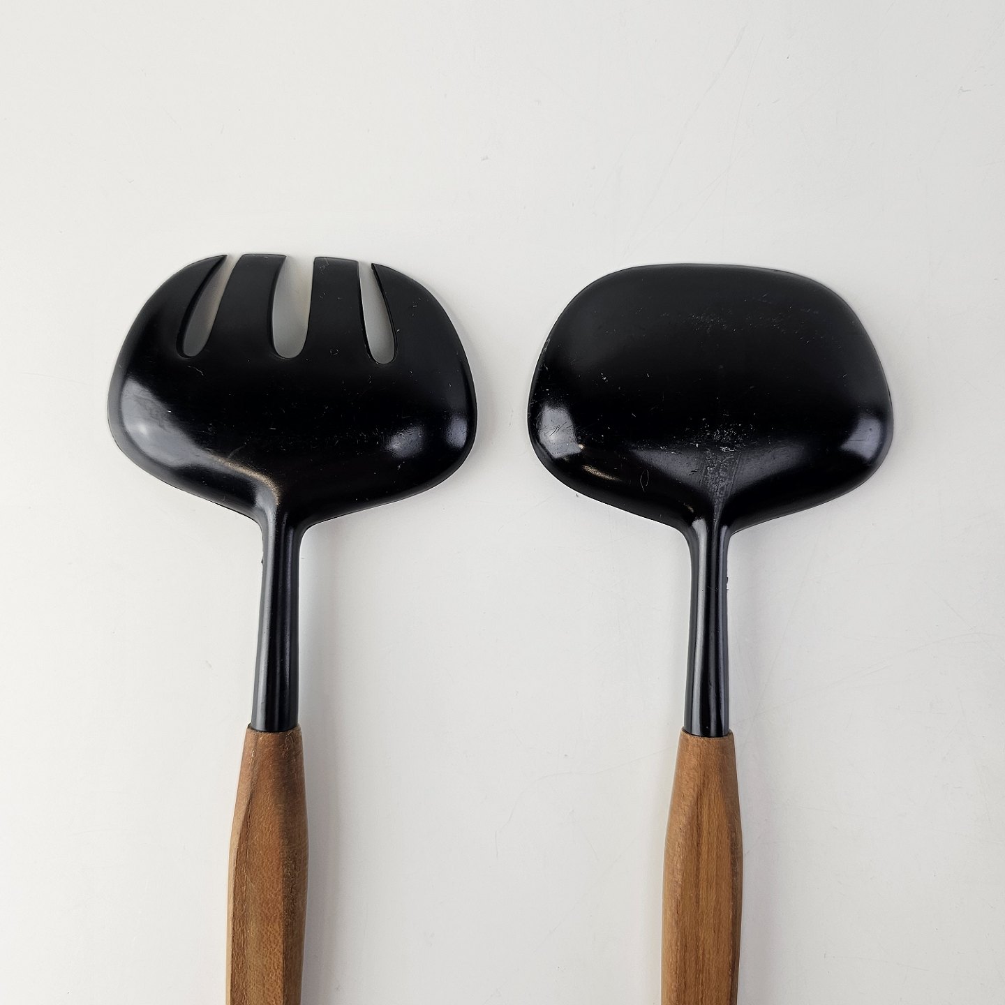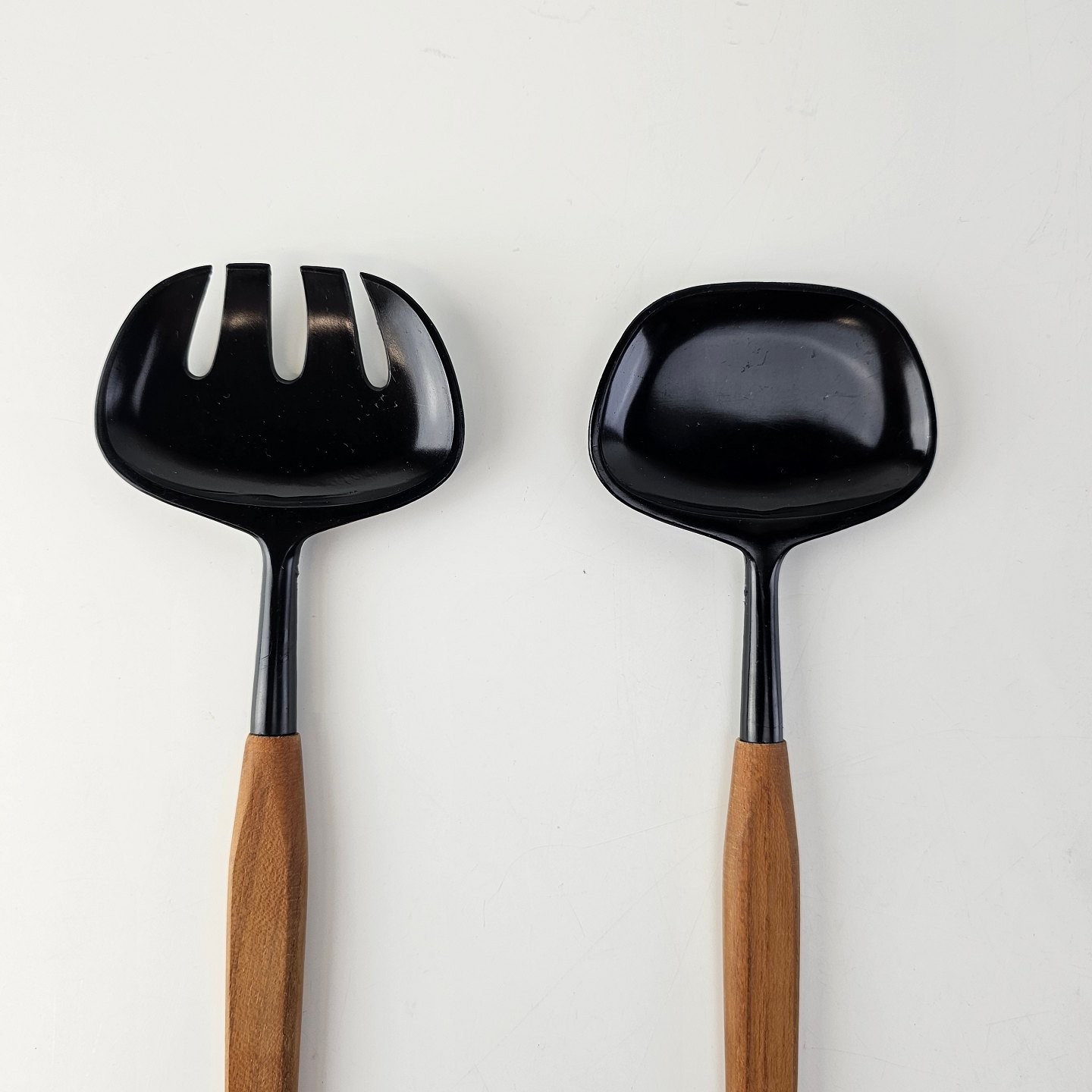 Salatbestik i sort plastik med skaft i teak træ