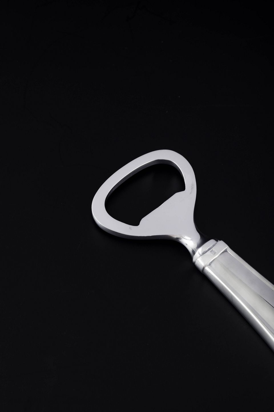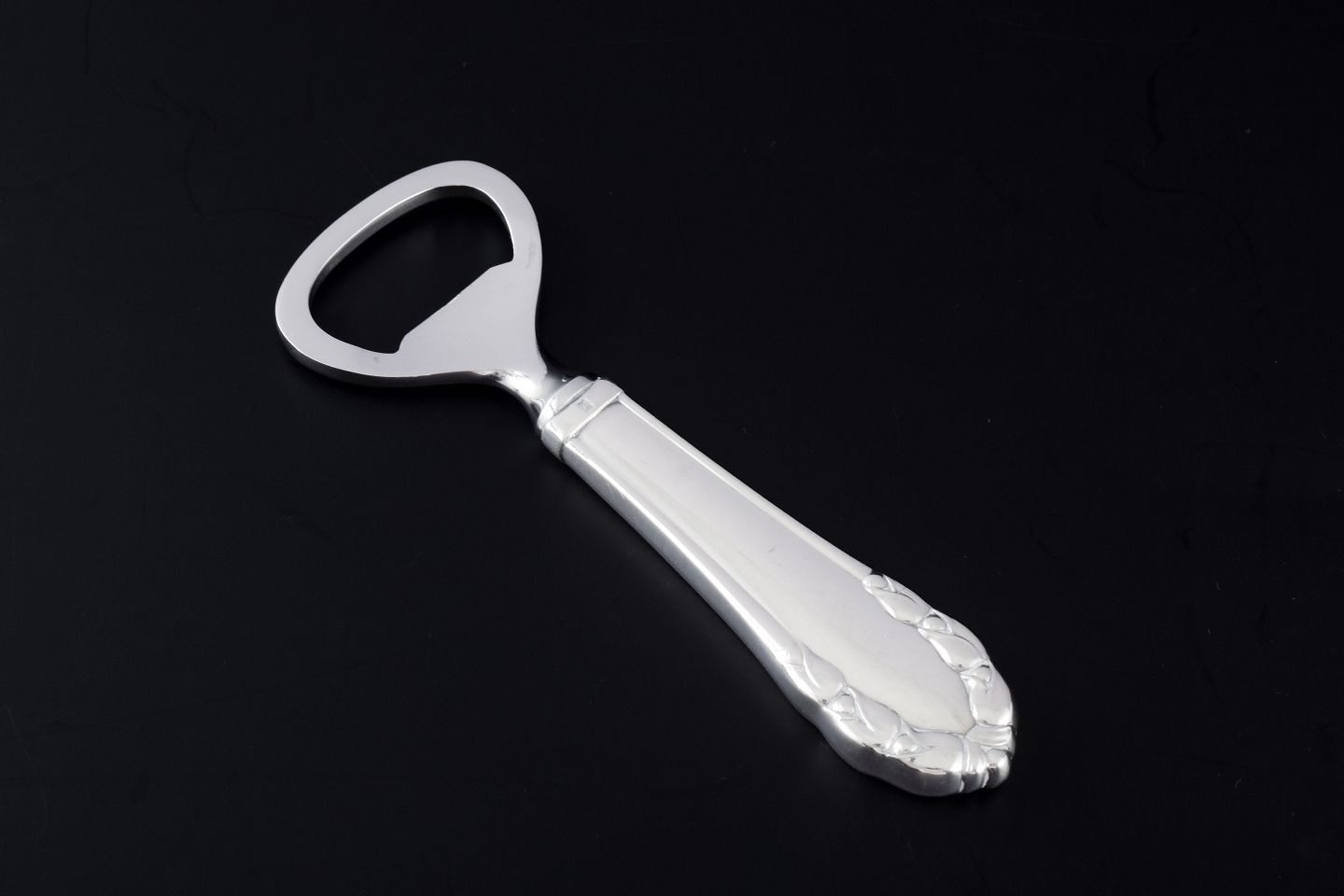 Flaskeåbner i mønsteret "Liljekonval" (Lily of the Valley). Blankpoleret sterling sølv, elegant skaftafslutning med diskret blomster- og bladmotiv.