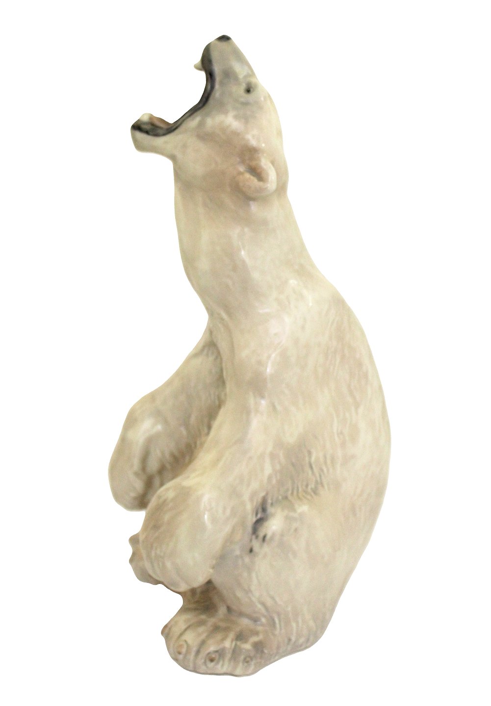 Royal Copenhagen, Stor siddende isbjørn der brøler. Nr. 502. Proveniens: Malerindens navn står i bunden, hun fik den som gave af Royal Copenhagen i 1974. Højde 32,5 cm. Bredde 15 cm. Dybde 12 cm. I. sortering. Flot stand. Pris: 2100 kr.