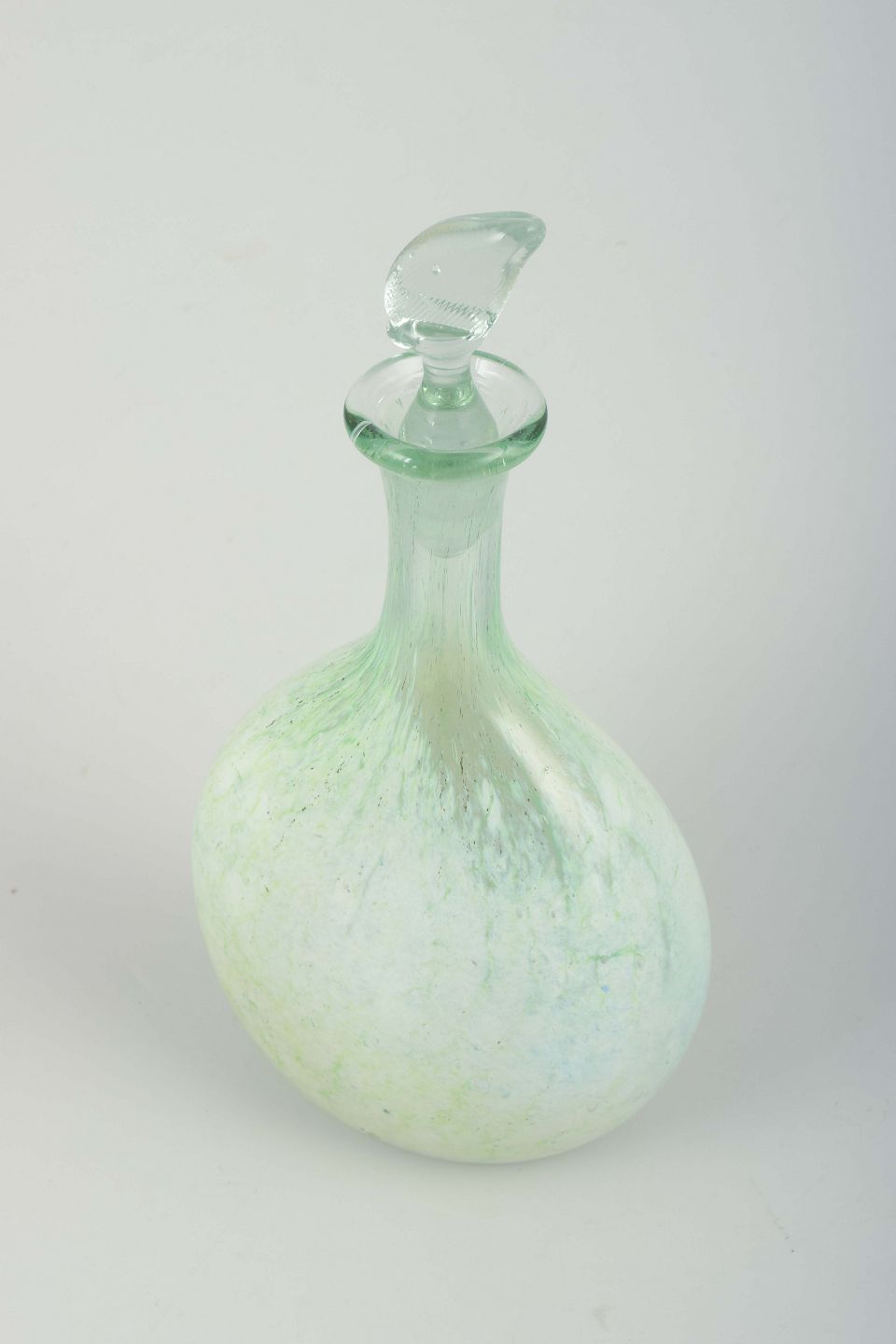 Mundblæst karaffel i klart glas med hvid- og grøntonede indslag. Original slebet prop. Slebet og indridset signatur samt årstal 1990.