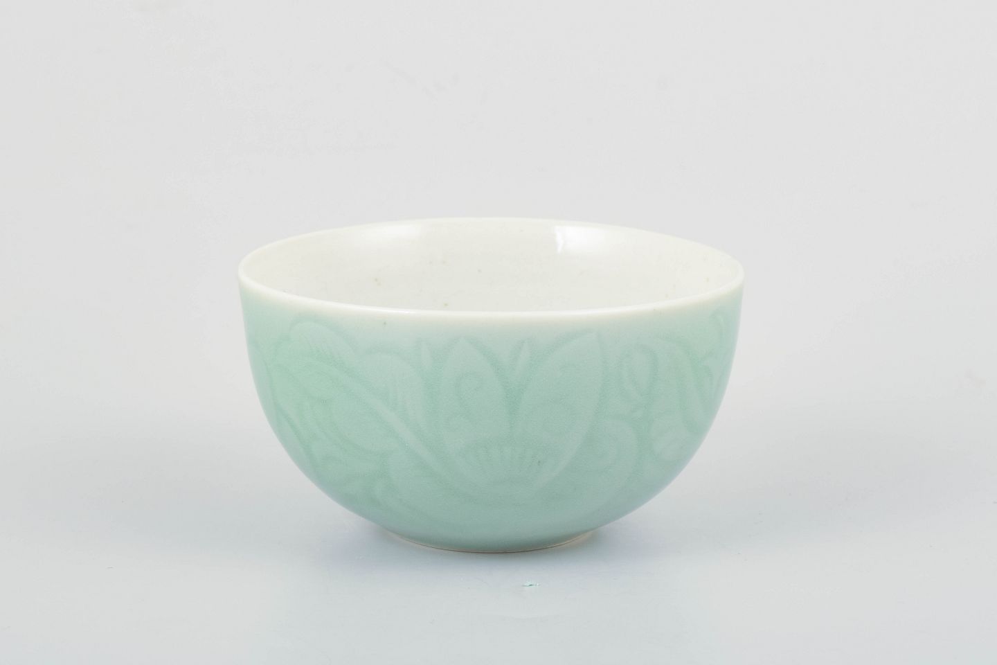 Lille skål i celadon glasur med reliefdekoration af stiliserede blade.