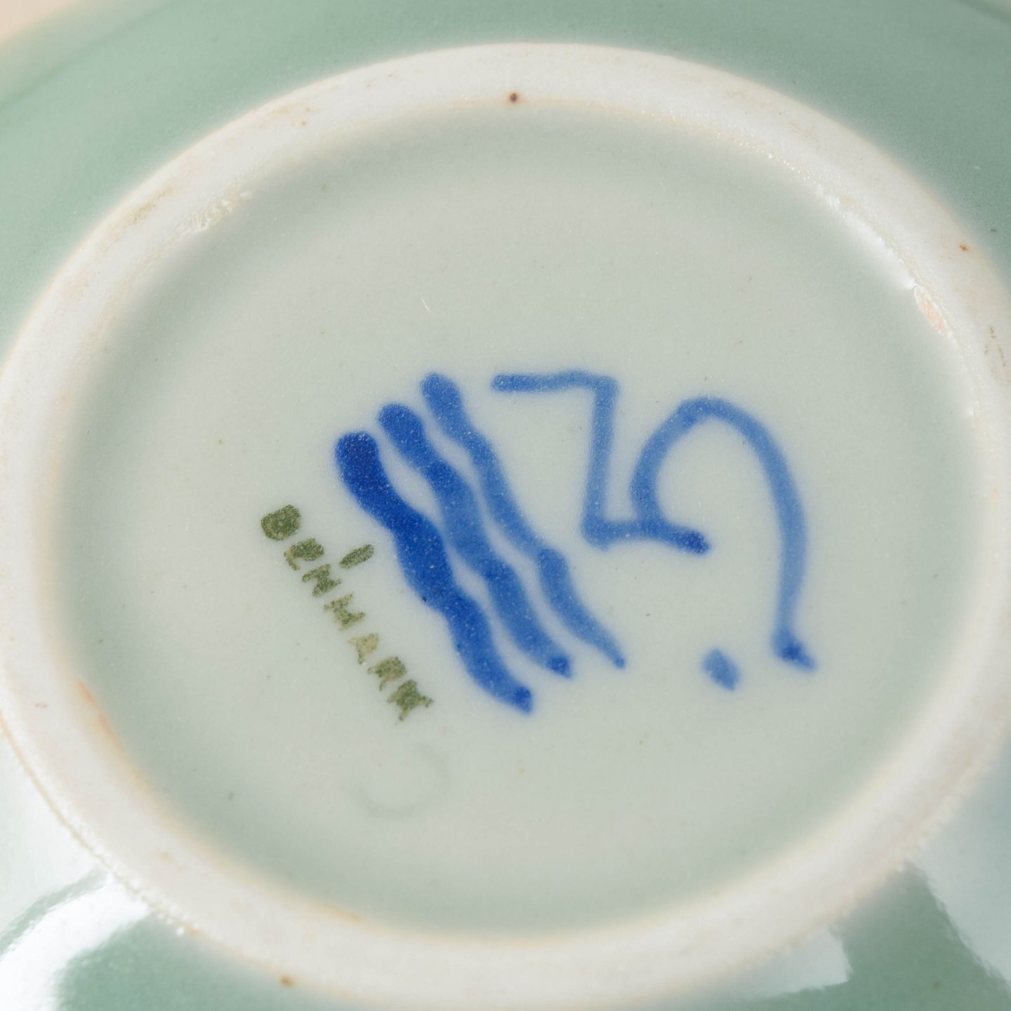 En elegant lille skål fra Royal Copenhagen med den klassiske celadon-glasur og indpresset bladdekor. Skålen er et eksempel på værkstedets forening af funktionalitet og raffineret håndværk i midten af det 20. århundrede.