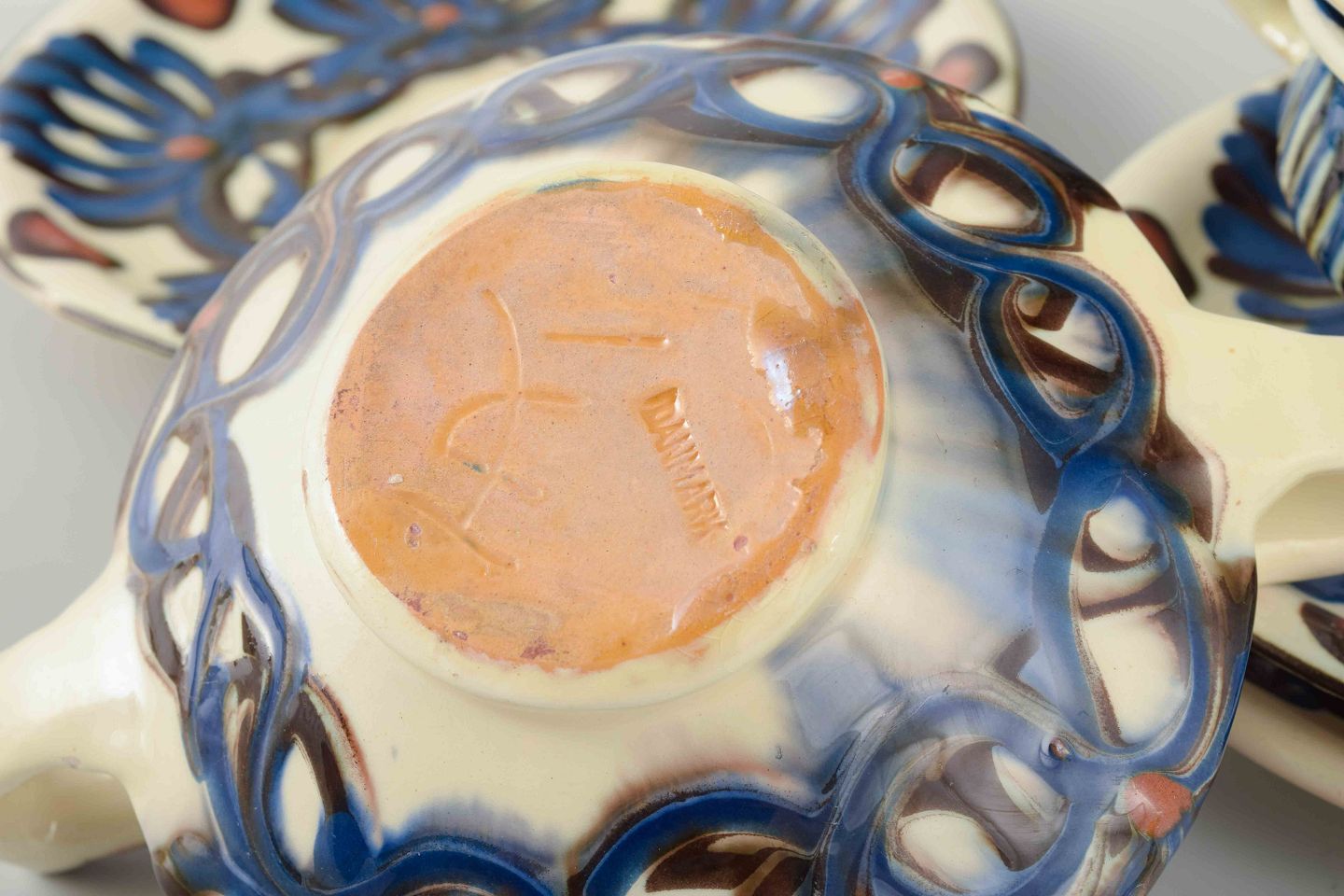 Et dekorativt sæt på tre bouillonkopper med underkopper fra Kählers værksted, hvor traditionelle former og farver forenes i et udtryk, der kombinerer brugskunst med dekorativ folkekunst.