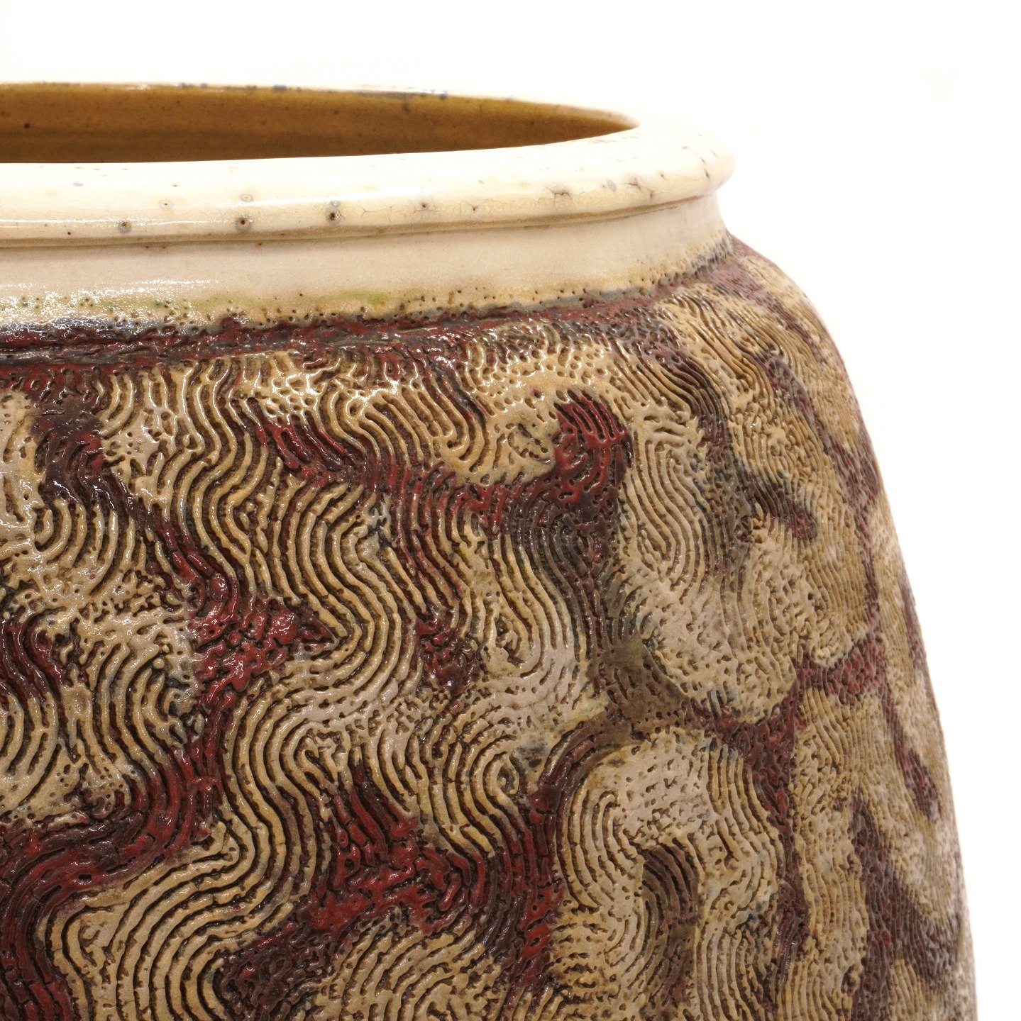 Kolossal Per Weiss stentøjsvase med ornamental relief dekoration med rød og grøn glasur. Signeret Per Weiss, 1953-2023. H: 95cm. D: 70cm