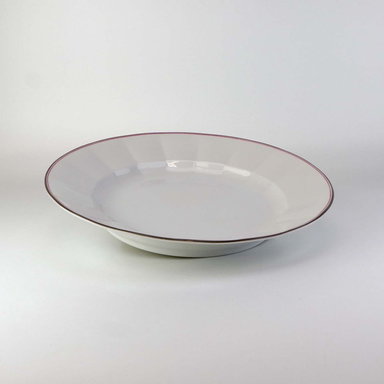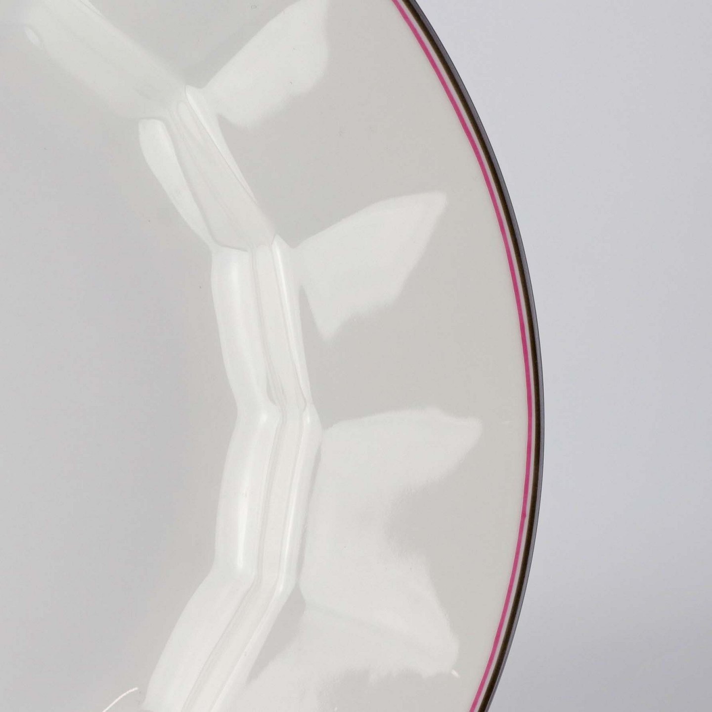 Service i kantet hvidt porcelæn dekoreret med lyserød og grå stribe ved kant.