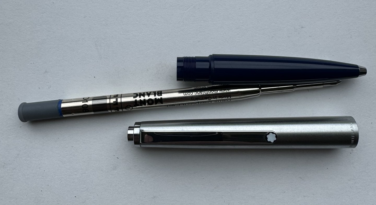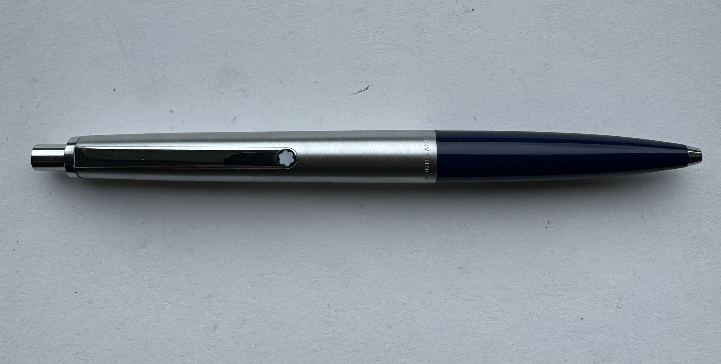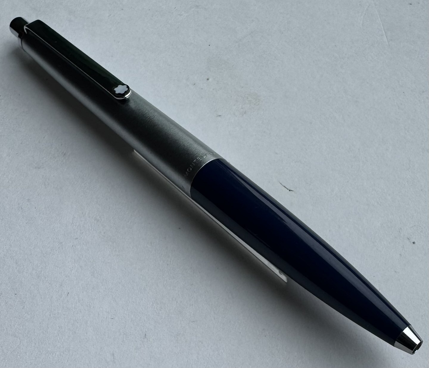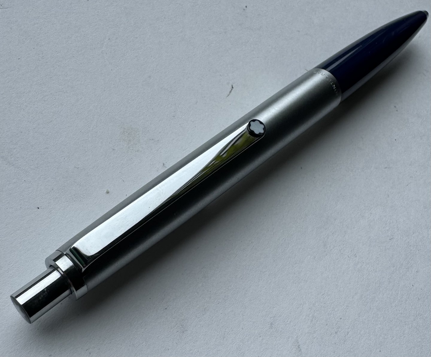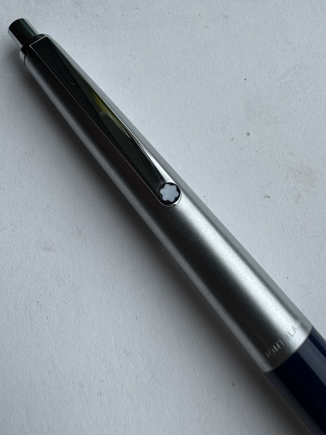 Montblanc Traveller 5201 ballpoint pen. Blue bottom with brushed steel top design. In perfect condition. Ready to use! Works with original Montblanc refill.