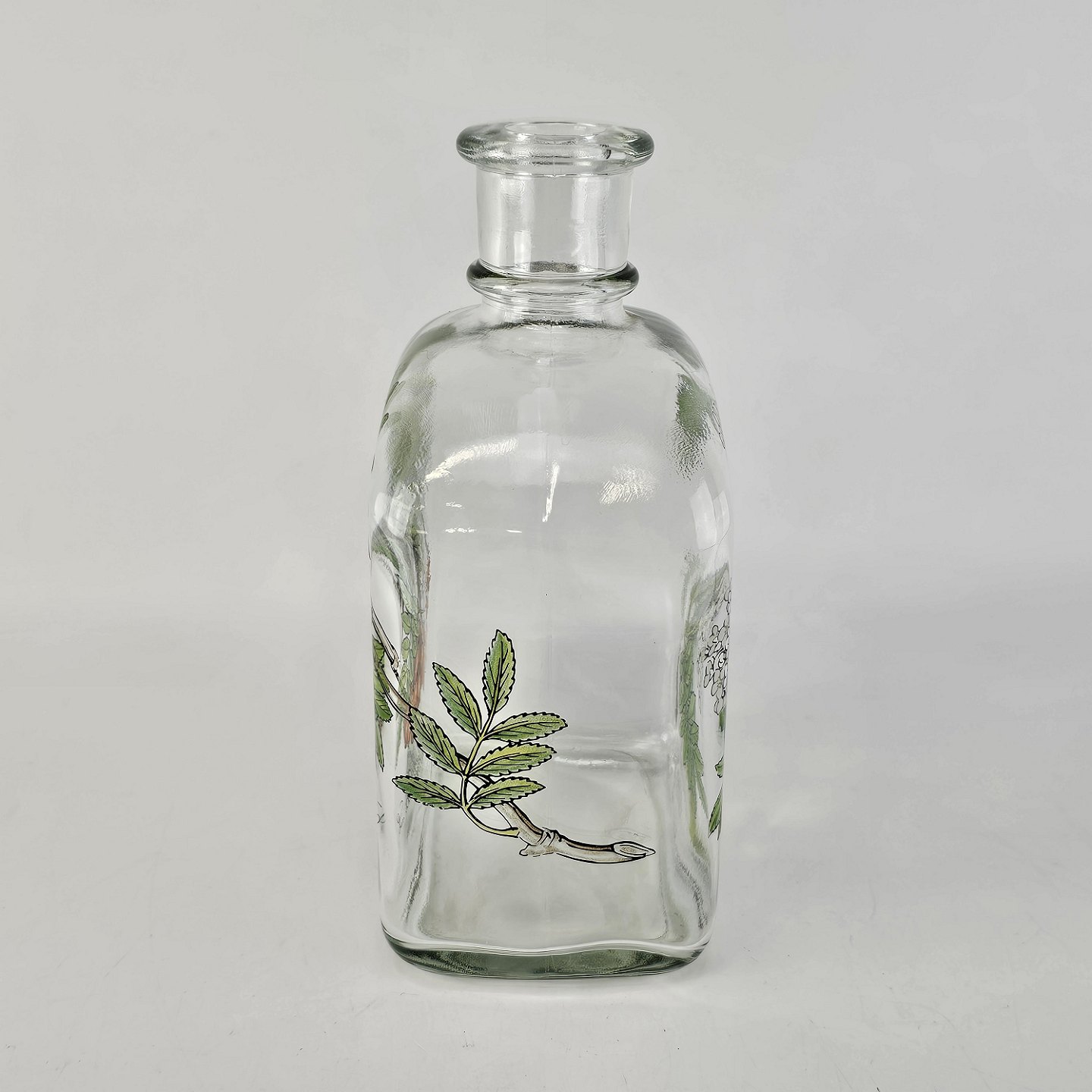 Text available in Danish: Karaffel i klart glas med korkprop fra serien Brændevins Amatøren, dekoreret med en gren af rønnebær og teksten Sorbus Aucuparia L.