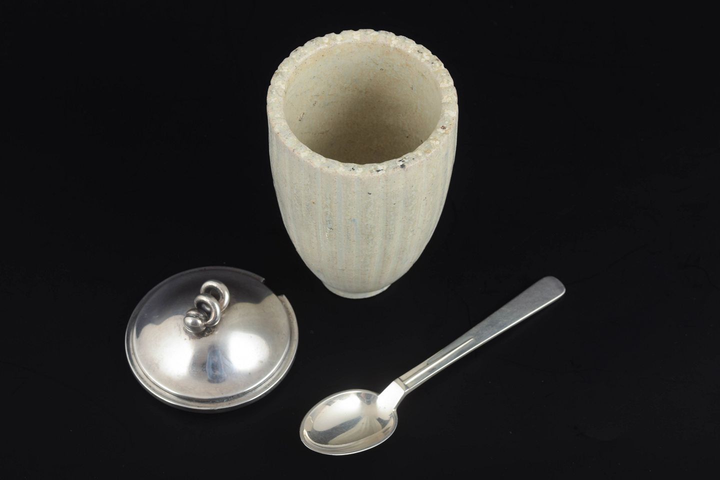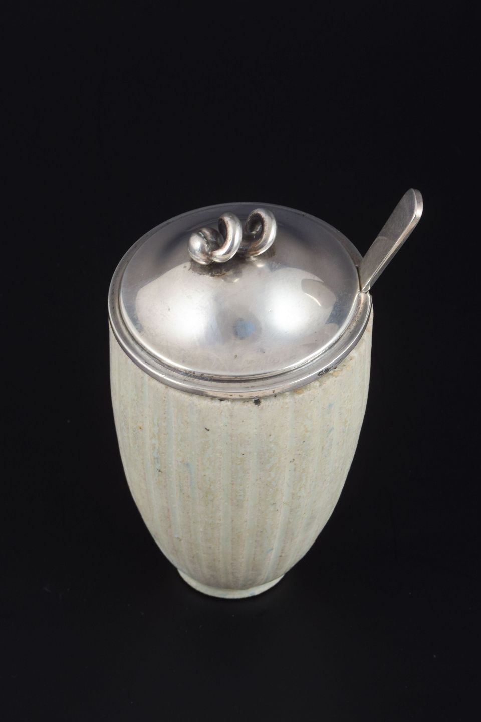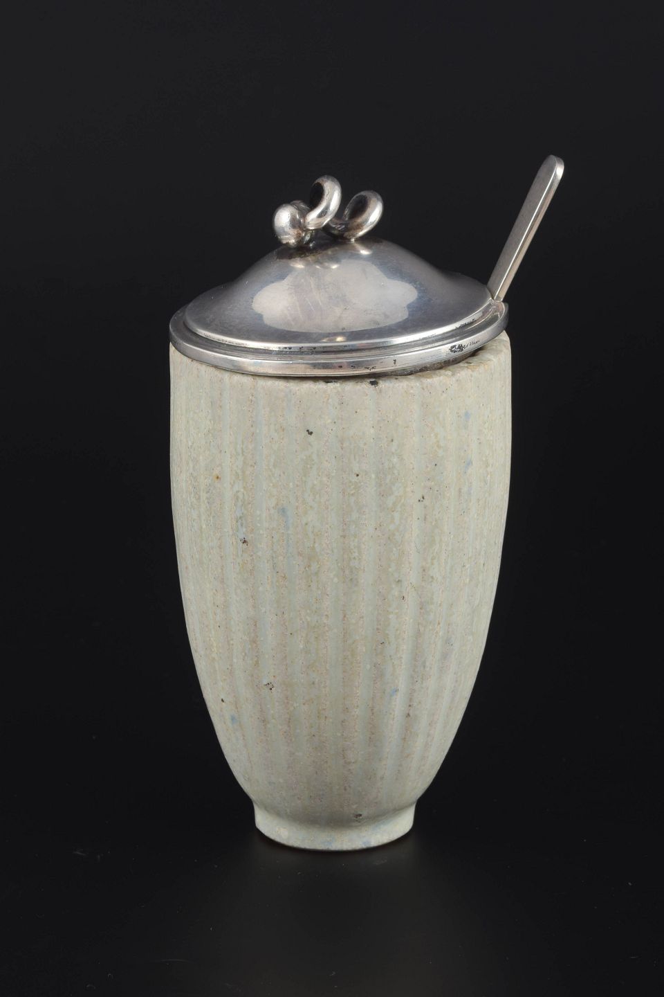 Cylindrisk riflet stentøjskrukke i grålig glasur, tilhørende låg i sølv stemplet C. Holm 830S, samt ske i sterling sølv stemplet Hans Hansen, Denmark Sterling.