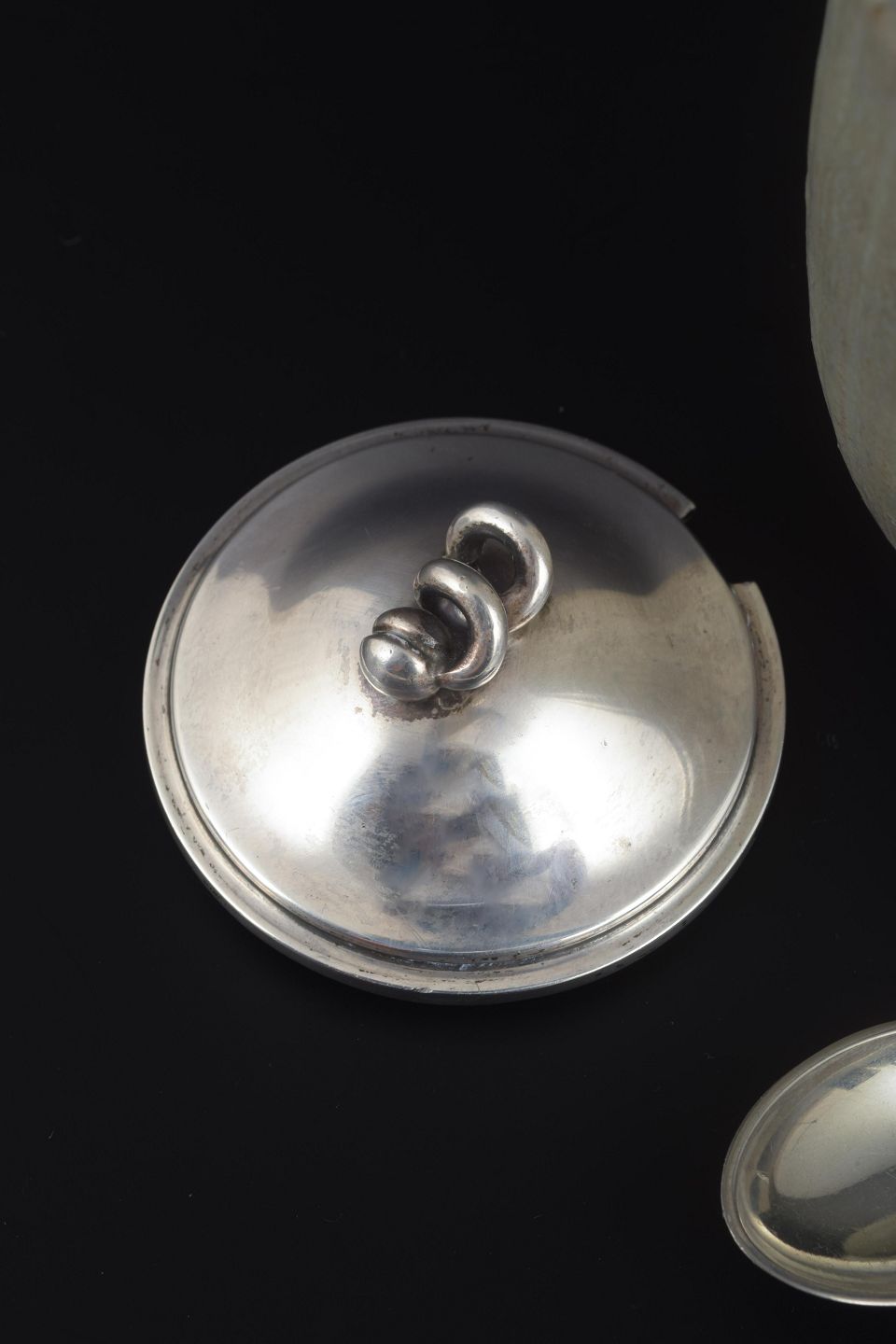 Arne Bang (1901–1983) var en af Danmarks mest markante keramikere i det 20. århundrede. Han var kendt for sine kraftfulde former, raffinerede glasurer og samarbejder med sølvsmede, hvilket resulterede i funktionelle og dekorative objekter med et særpræget dansk formsprog. Samarbejdet mellem stentøj og sølv understreger den danske kunsthåndværkstradition, hvor forskellige materialer kombineres i tidløse designs. Hans Hansen (1906–1983) grundlagde sit sølvsmedeværksted i Kolding, hvor han blev en af de førende inden for moderne skandinavisk smykkedesign og sølvarbejder.
