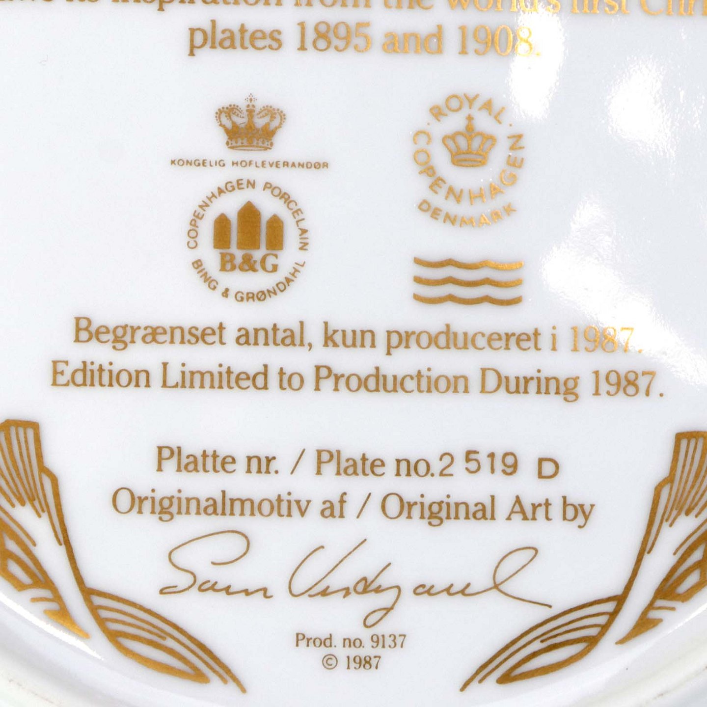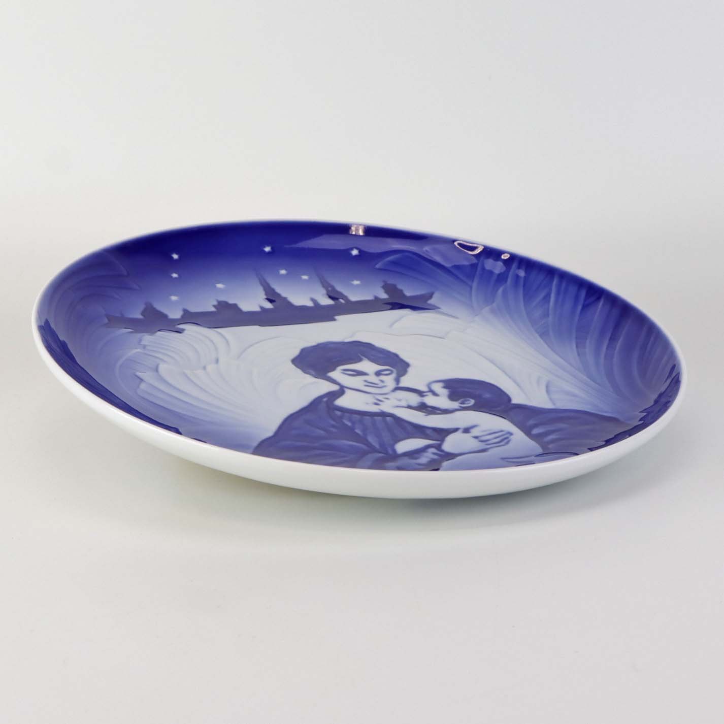 Håndmalet mindeplatte i porcelæn fra år 1987 i anledningen af sammenslutningen af Danmarks to store porcelænsfabrikker Bing & Grøndahl og Royal Copenhagen. Motivet er inspireret af juleplatten fra år 1895 og år 1908.