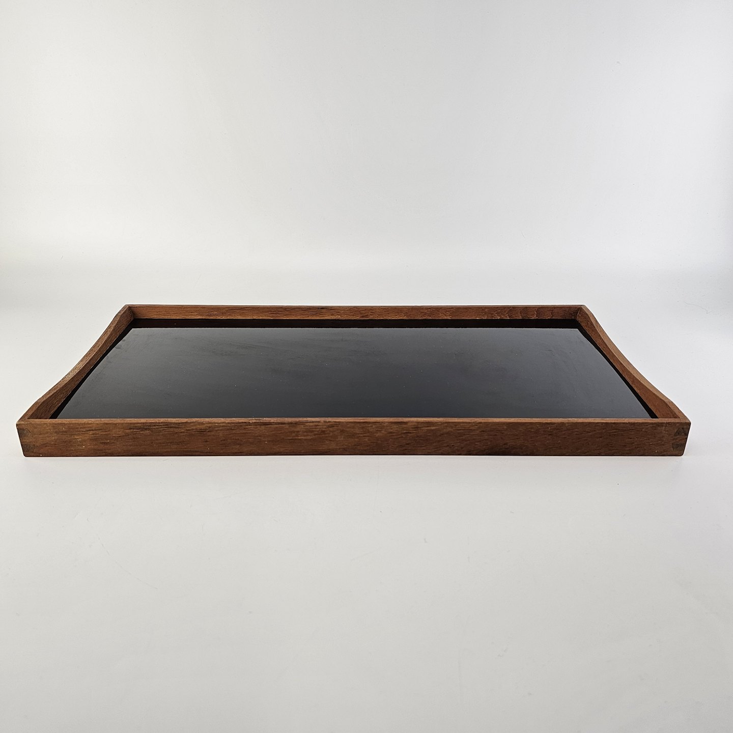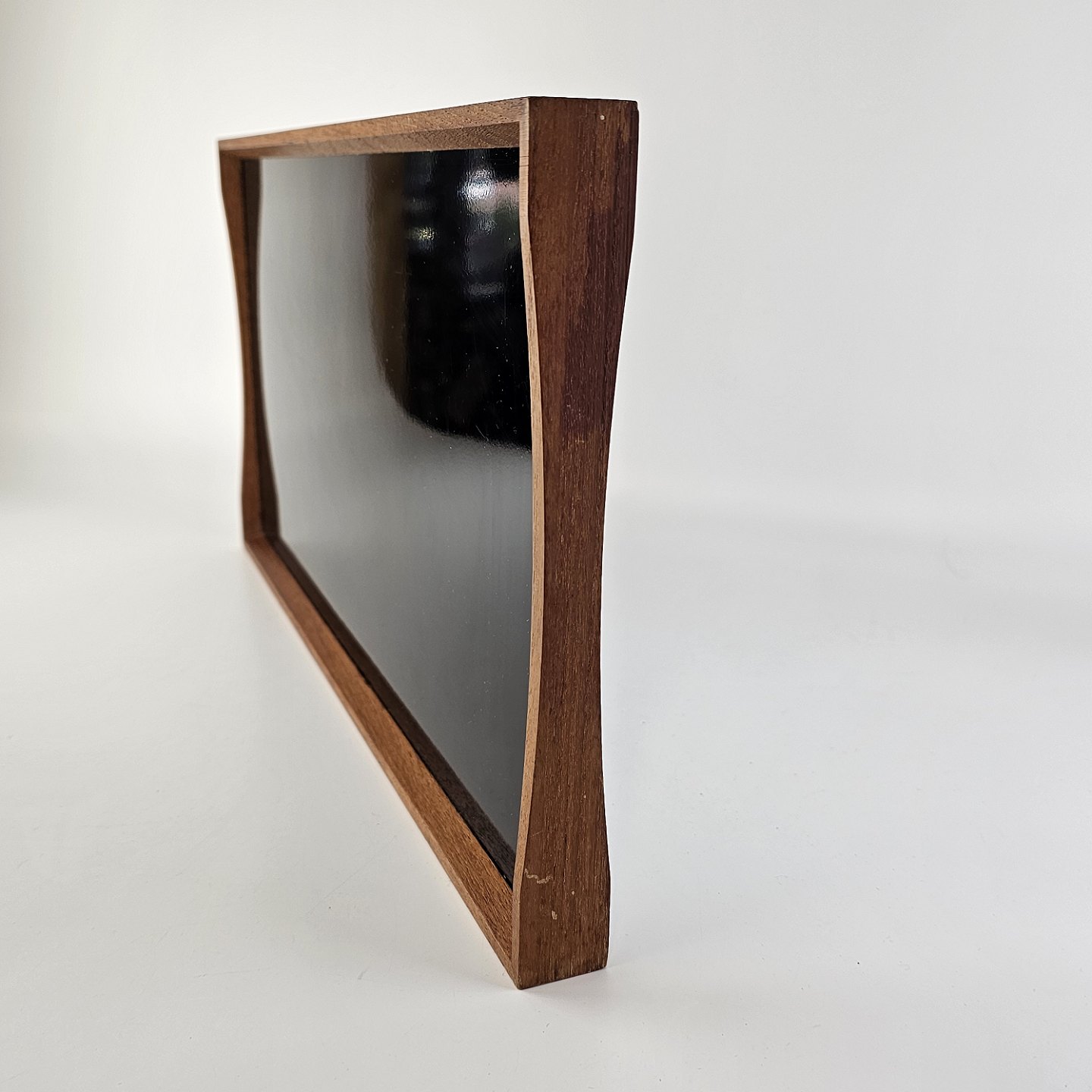 Vendbar bakke i teak tre og højglans laminat, sort på den ene side og hvid på den anden