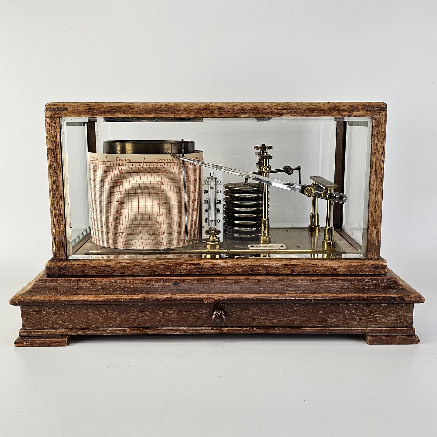 Barograf i kasse af træ og glas, med en skuffe i bunden