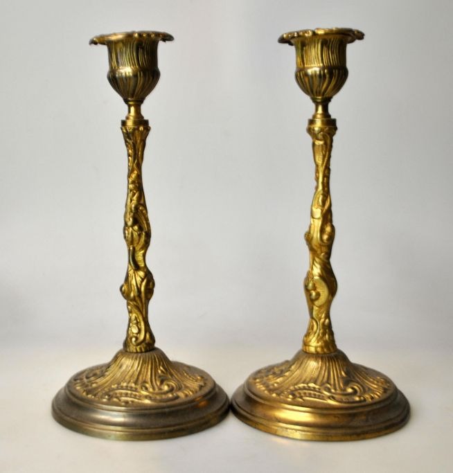 Par franske stager, 19. årh. Med udsmykninger af blomster og snoninger. På rund fod. H: 20 cm. Dia: 9,5 cm.