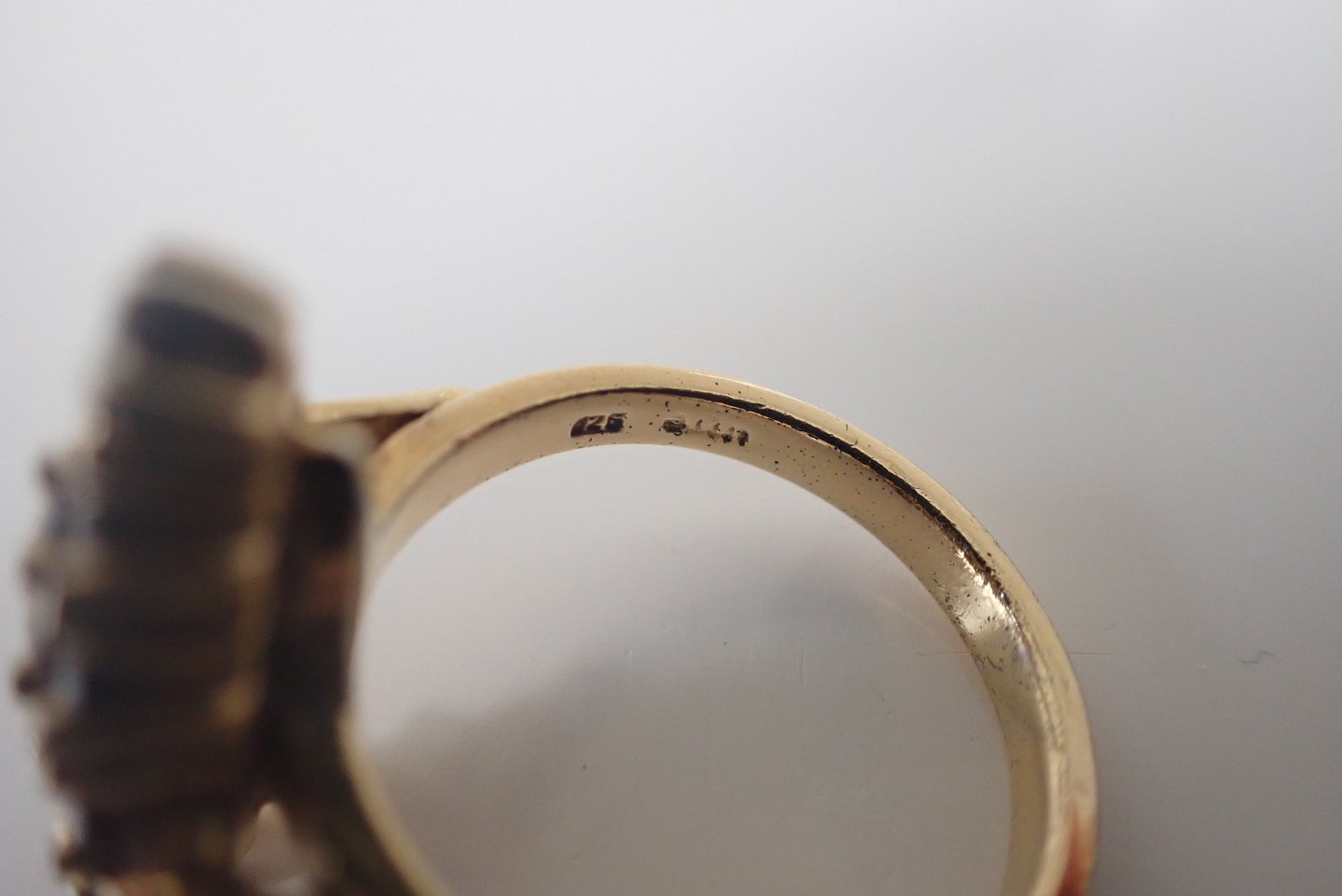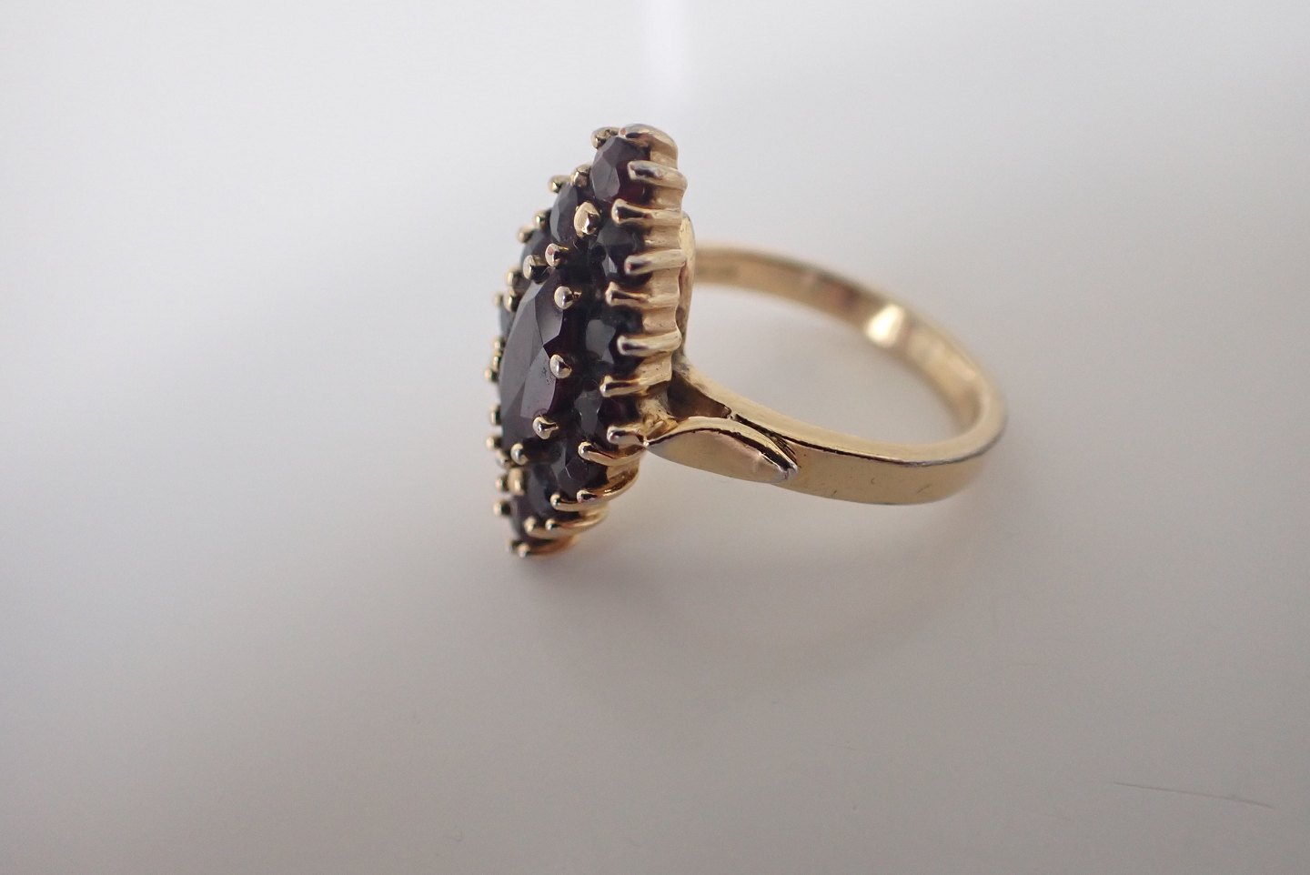 Forgyldt sterling sølvring med 12 små granater og en større sat i rombeform. Dansk. stemplet 925.Ca. 1990. Mål på romben: 2,1 x 1,2 cm. Ringskinnebredde: 0,3 cm. I fin stand.
