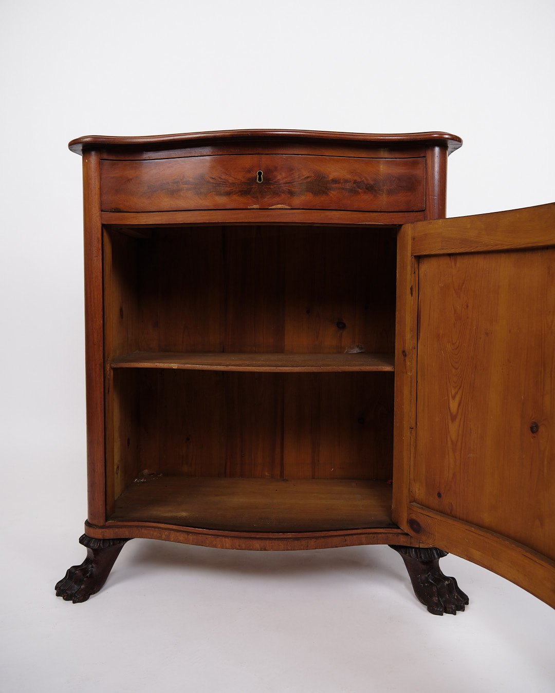 Small console/hallway unit from the 1890s, made of hand-polished mahogany with a flamed texture. The unit stands on detailed lion feet, which give it an elegant and classic look.