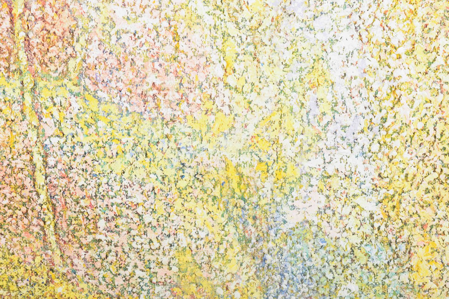 A lyrical, coloristic painting with a pointillist touch, executed in warm golden, white, and blue tones. The work has a meditative character, capturing the summer light in an abstract visual language.