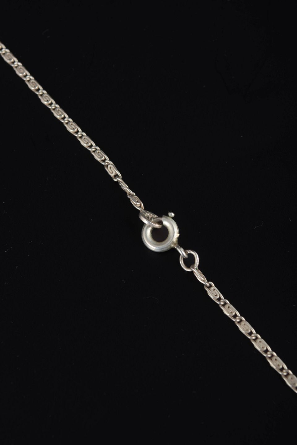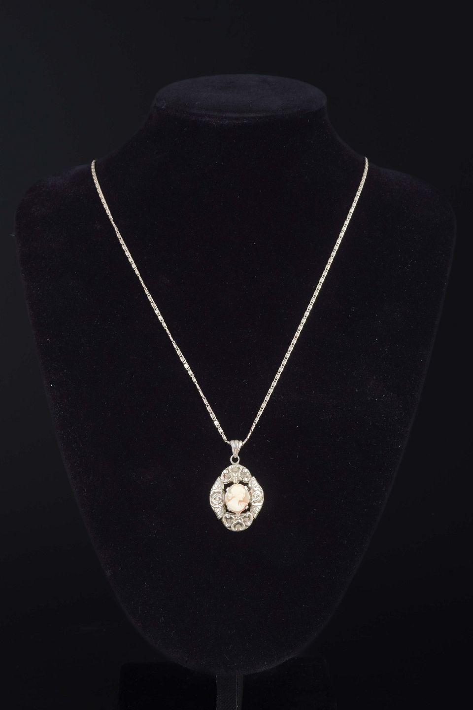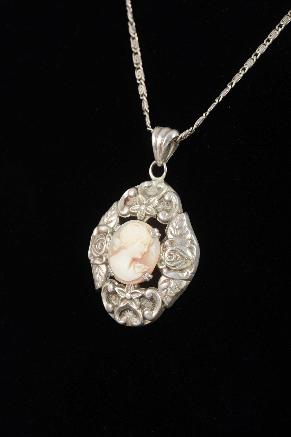 Silver necklace with pendant, finely crafted with a classical cameo and floral ornamentation.