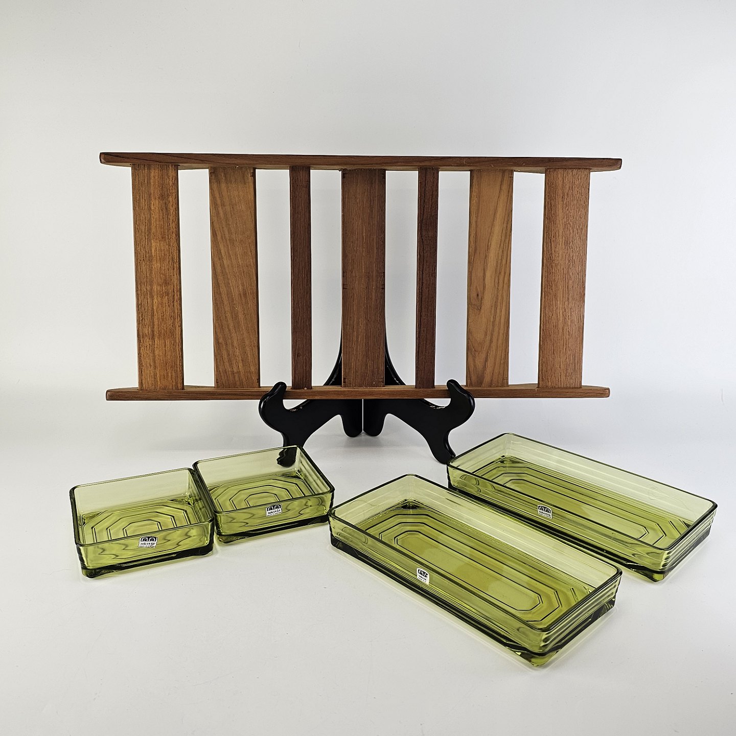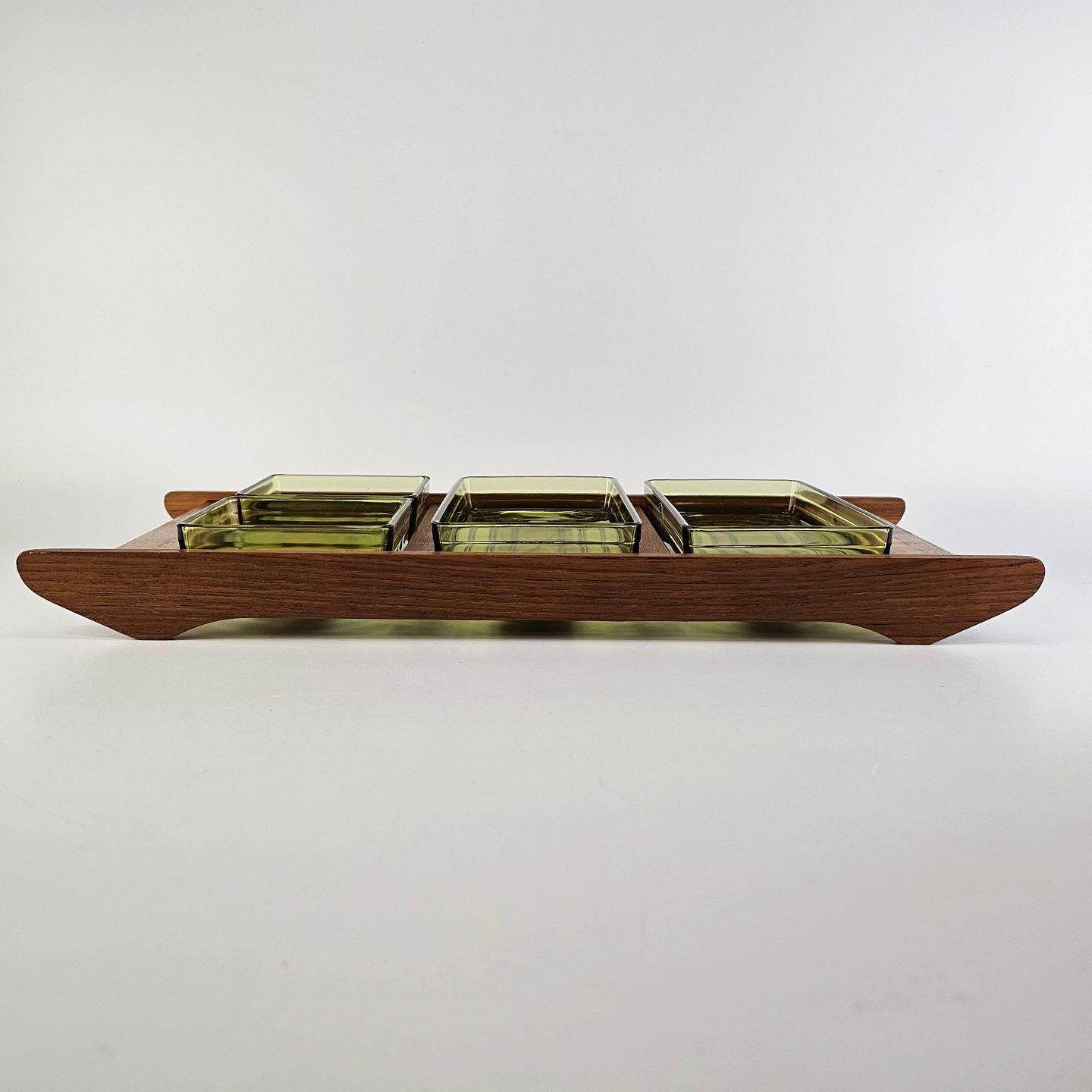 Cabaret fad i teaktræ med fire skåle af grønt presset glas i to forskellige størrelser