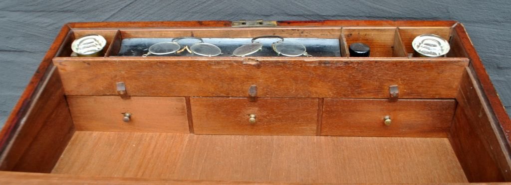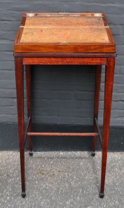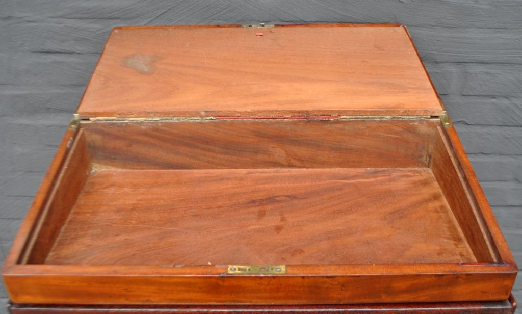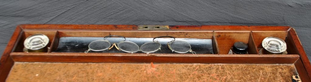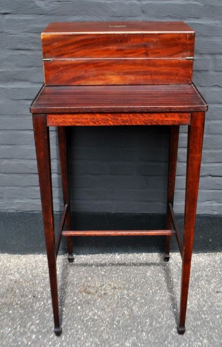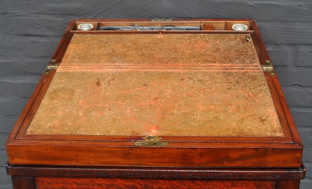 Engelsk antikt skriveskrin, ca. 1820. Med nyere underdel - special fremstillet. Skriveskrin i mahogni med indvendig skriveplade i læder. Med hemmelige rum. Inkl. to blækhuse, to par briller og et Winsor & Newton blækhus med brunt blæk. Pult og skrin samlet H: 113 cm. B: 55 cm. D: 56 cm. Skrin lukket H: 19 cm. B: 54 cm. D: 27 cm. Skrin åbnet H: 14,5 cm. D: 55 cm.