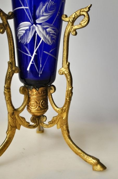 Antik cobolt blå vase med emaljemaleri, 19. årh. Tyskland. Monteret i bronze stativ. H.: 28,5 cm.