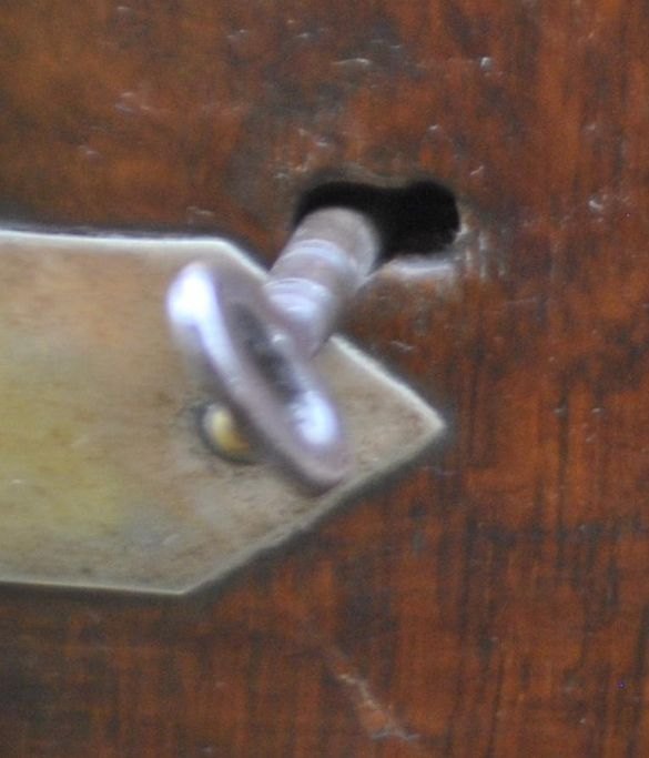 Tantalus of oak with two different crystal decanters with stoppers. England. 19th century. Brass handle and fittings. Side opening with lock and key. L: 26 cm. H: 32 cm.
