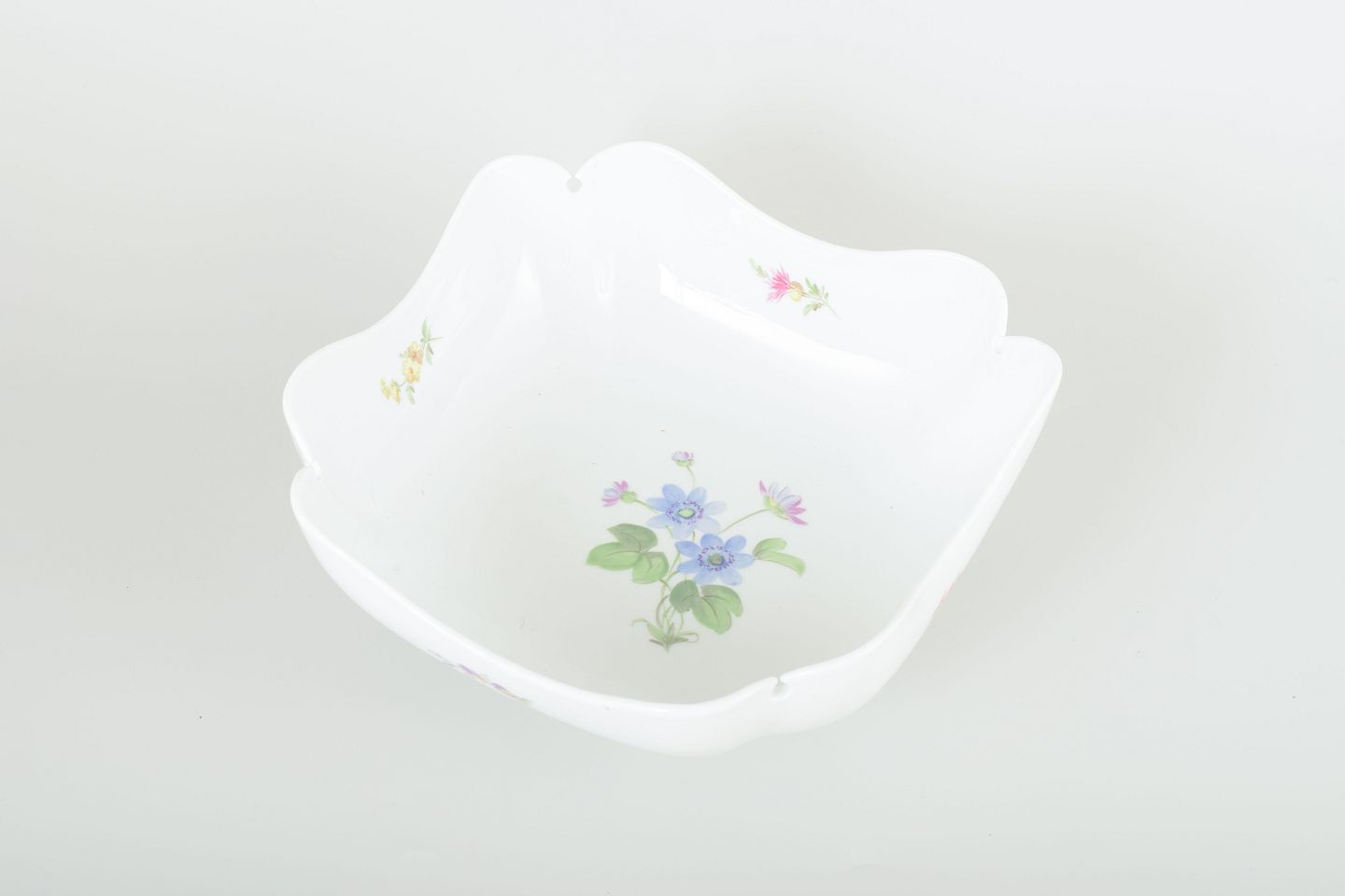 Elegant skål i porcelæn med bølget kant og håndmalede blomsterdekorationer i flerfarvet palet. Klassisk Meissen-design med blød form og delikat staffering.