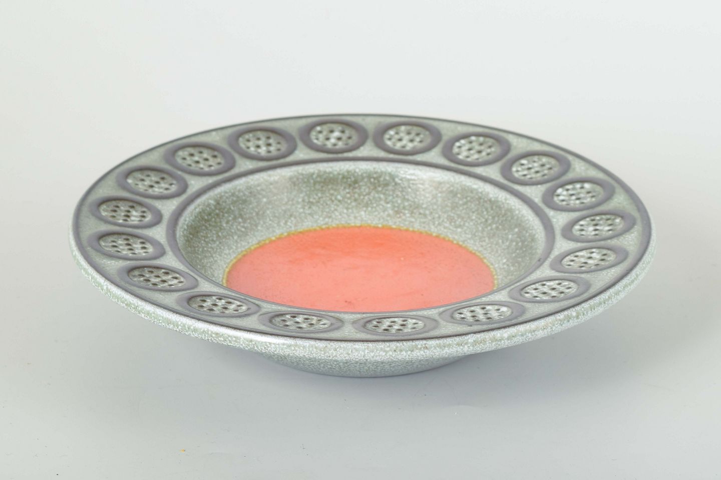 Decorative stoneware bowl with orange glazed center, surrounded by silver-grey and dark brown bands featuring circular relief motifs along the rim.