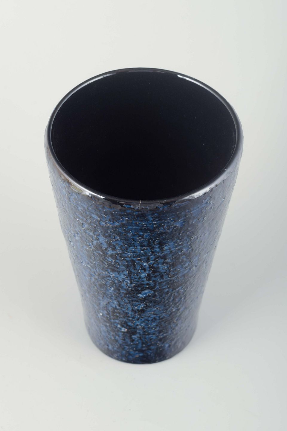 Cylindrisk vase i stentøj med dyb, mørkeblå glasur med let krystallinsk struktur.