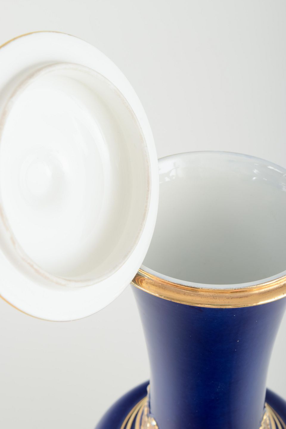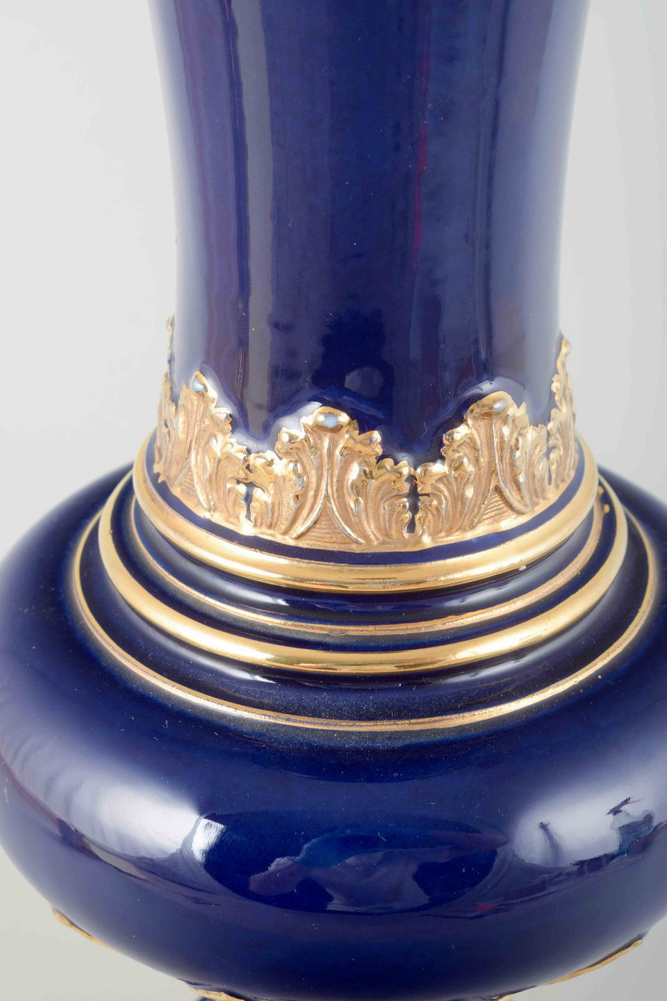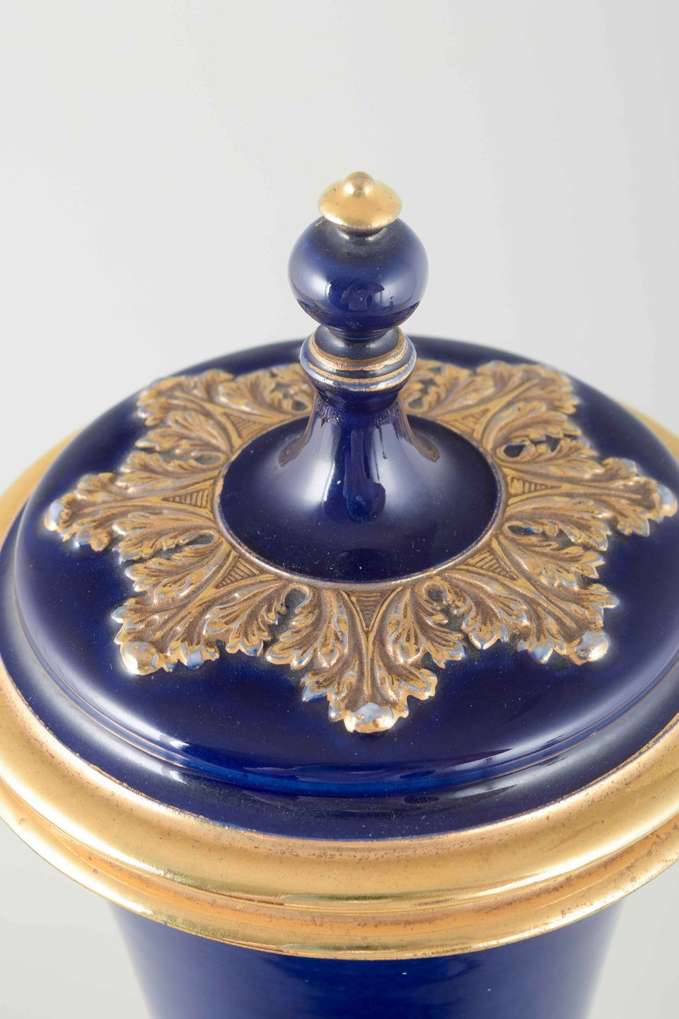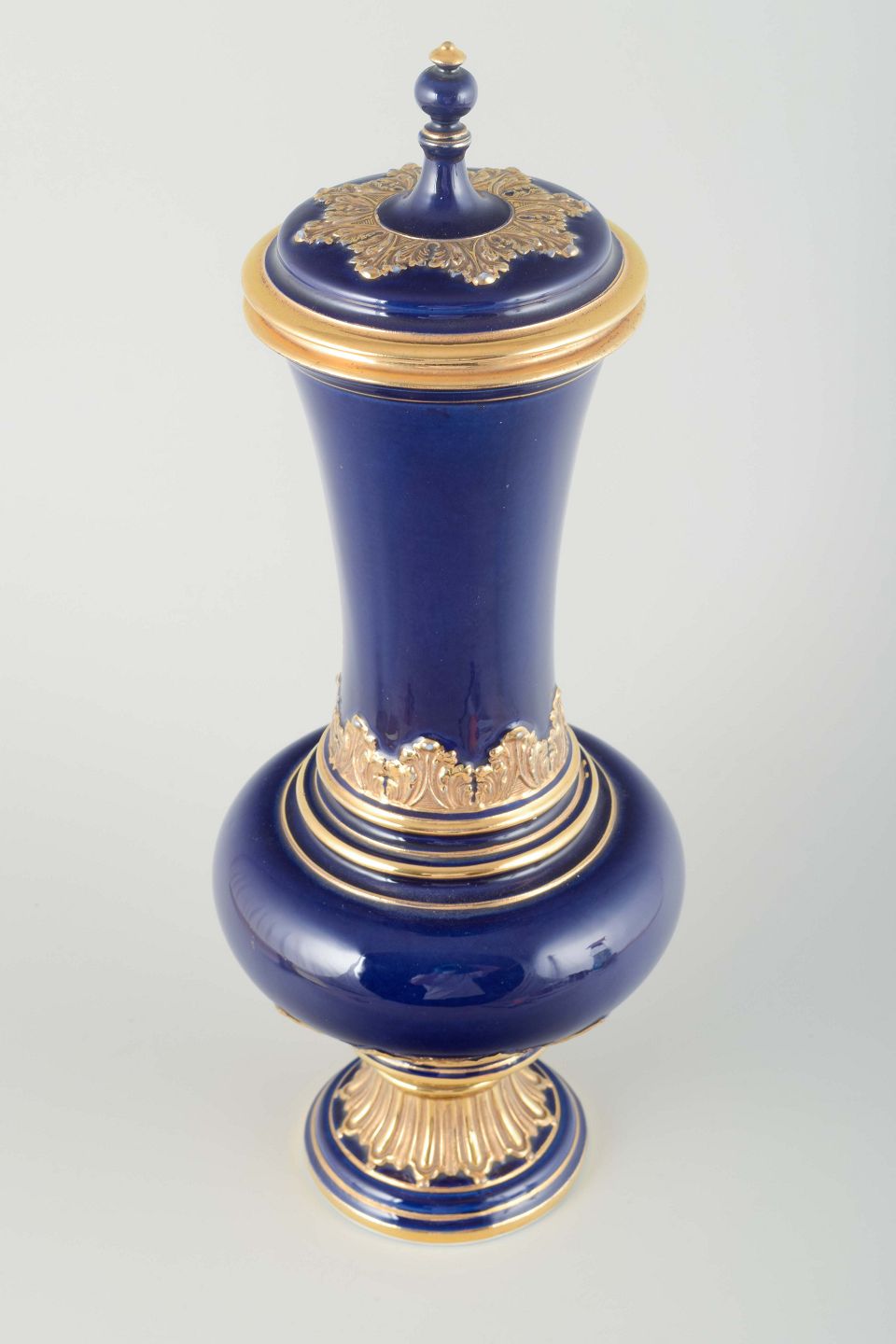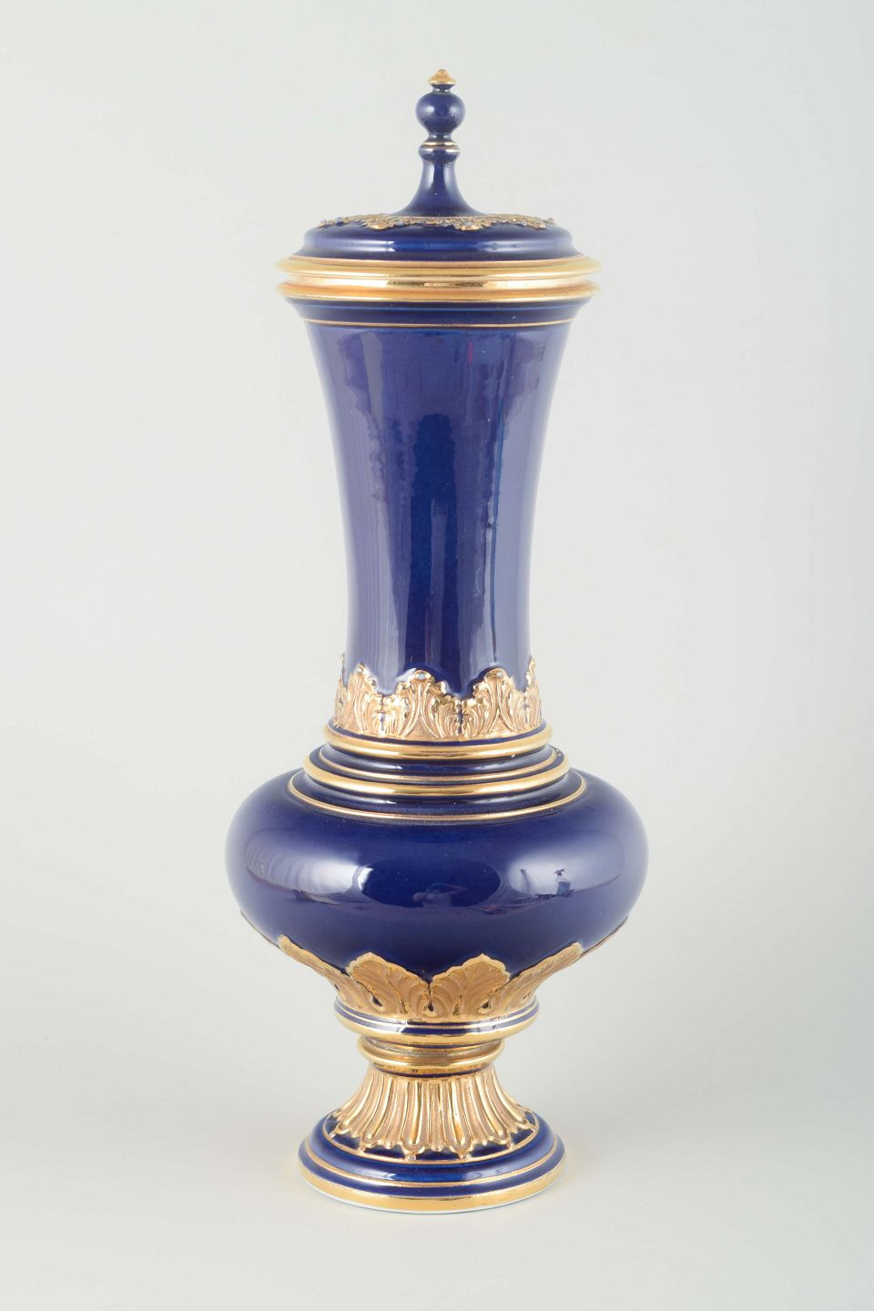 Elegant porcelænsvase med låg i dyb koboltblå glasur, rigt dekoreret med forgyldte akantus- og båndmotiver. Klassisk form med profileret fod og svungen hals, udført i Meissens karakteristiske kvalitet.